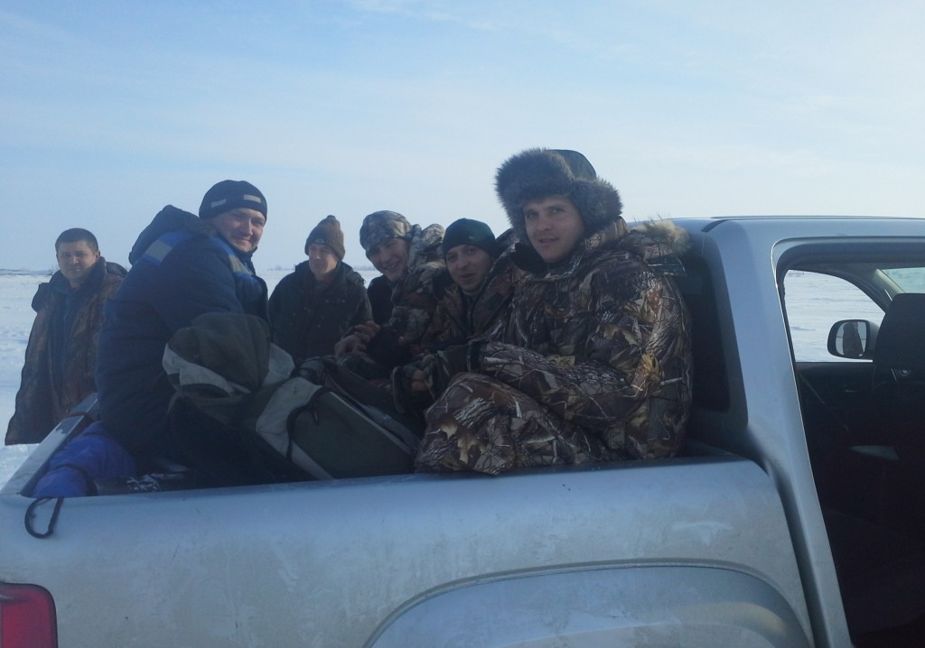 Из 5 оставшихся наших машин, 3 пришлось оставить в полях. Дорога очень тяжелая и было принято решение дальше пробиваться на 2-х - Amarok Volkswagen и УАХ Хантер. 15 рыбаков разместились в них на "Ура". Самым молодым достались места в кузове!