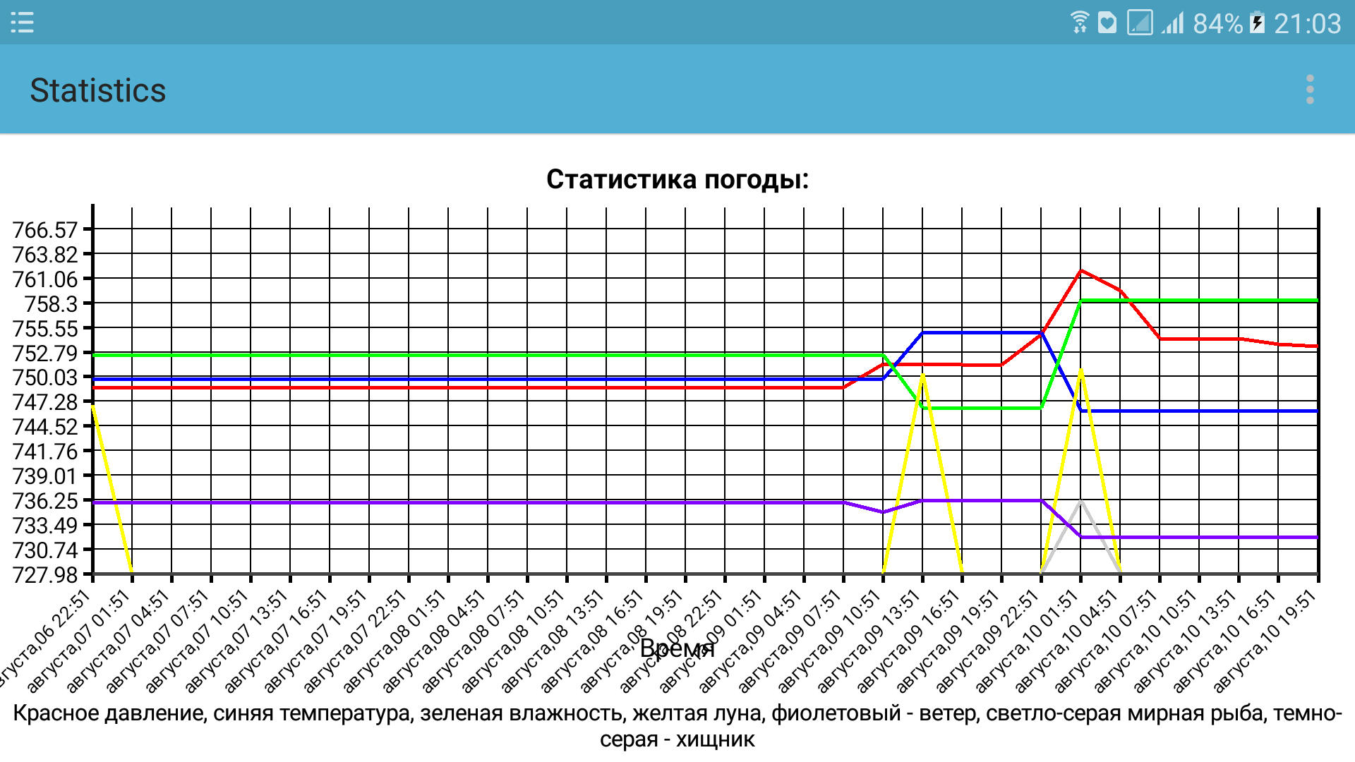 Дикий ветер в 11 вечера испоганил всю рыбалку. Оказывается, давление скакнуло. Скриншот моей Android-программы Barofisher, сохраняющей статистику погоды. Красная линия - реально измеряемое давление датчиком телефона, фиолетовая линия - скорость ветра из прогноза погоды ! Который нифига не соответствовал буре !