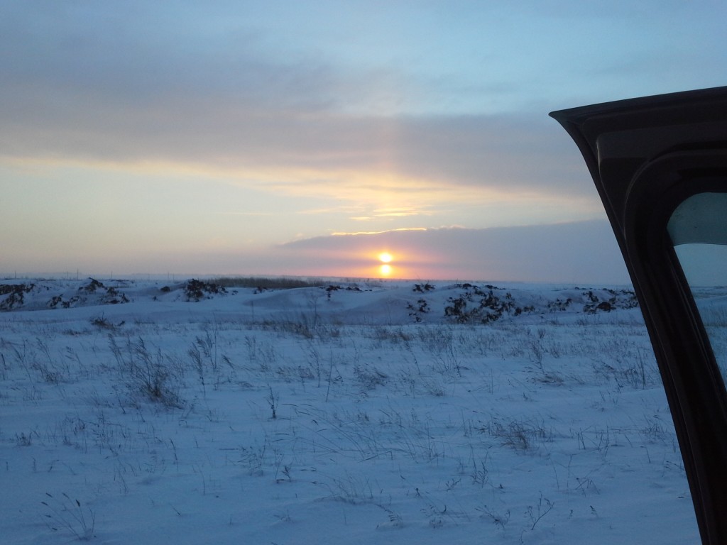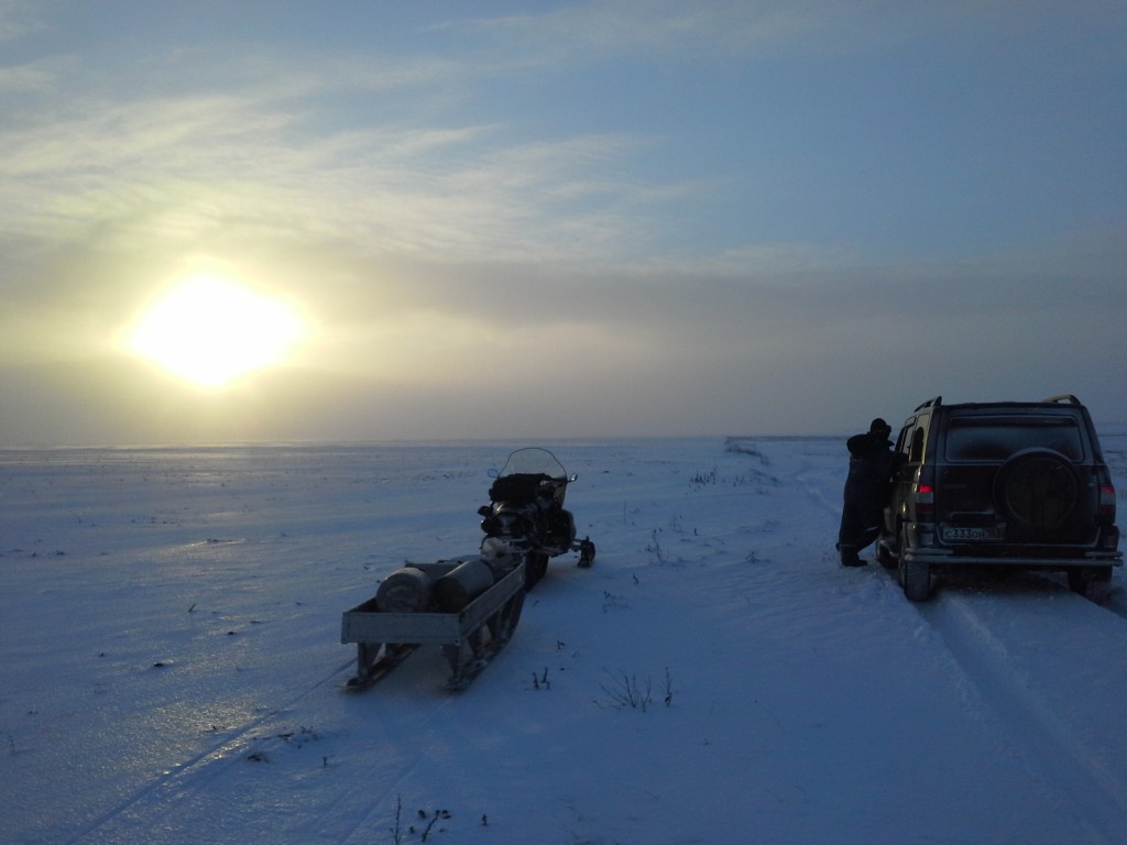Угостили чаем, пожаловались плохую охоту из-за отсутствия следов на насте. Сказали: "Что интересного нас фотографировать? Вот, если бы сзади снегохода был привязан кабанчик, тогда - другое дело!" Пожелали удачи и поехали охотиться дальше.