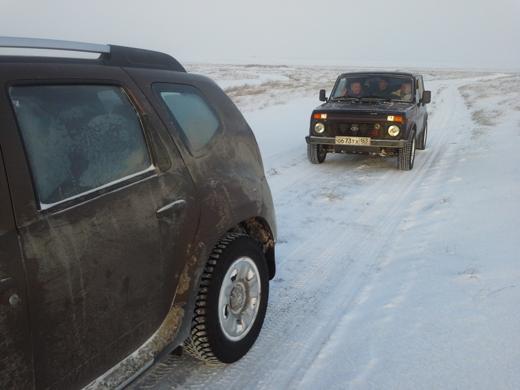 При помощи лебедки, зацепив трос за Дастер, вытягивали УАЗ