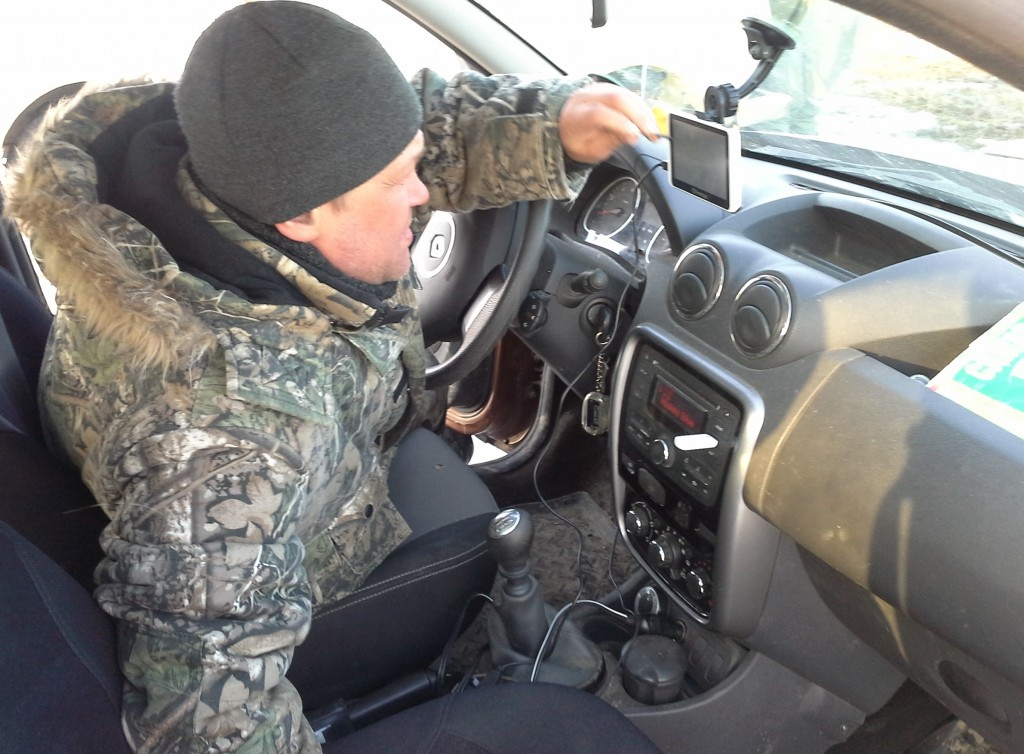 Настраивает свой навигатор в "Дастере" на обратный путь в Самару.