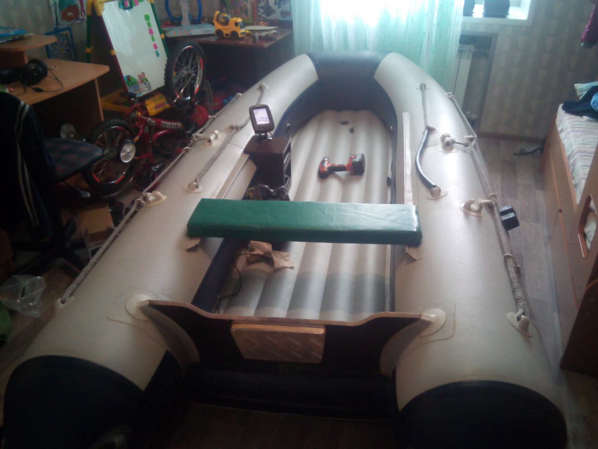 Еще можно сдуть борта, и на 2 табуретки положить только днище и потоптаться сверху. А перевернув лодку вверх дном получаешь замечательный батут для детей.