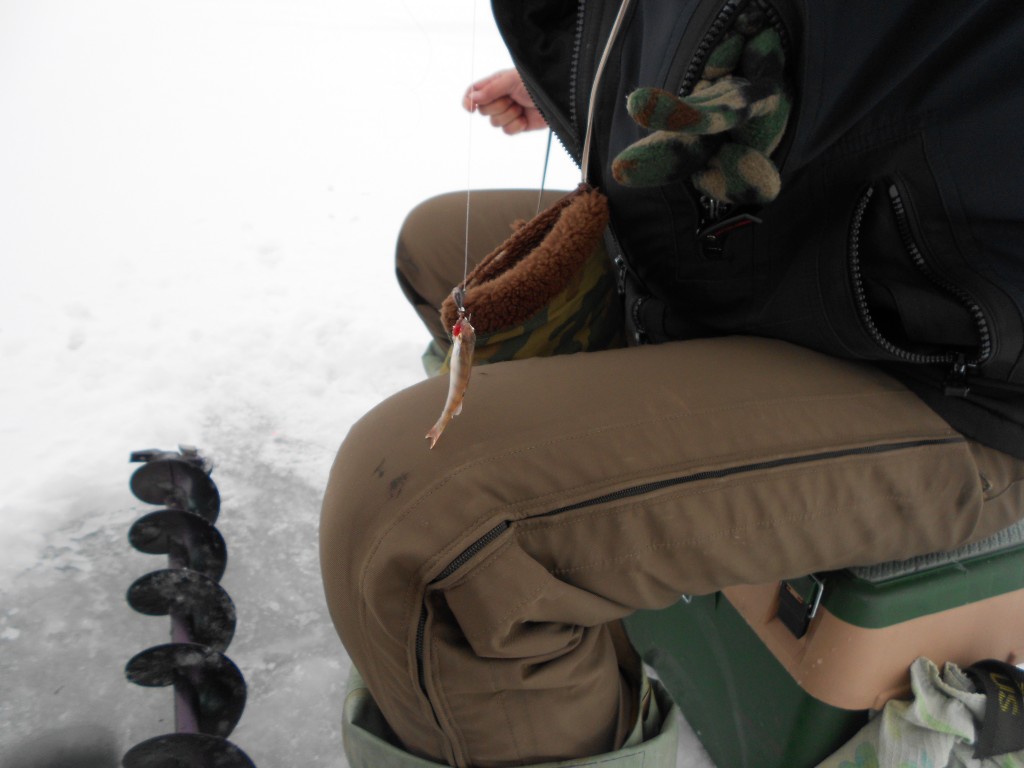 Менял леску с 0,12 на 0,16, затем на 0,22. Не помогало. Но все же одного самого «мелкого» на 2.5кг он поймал. Выдрал из лунки багром.