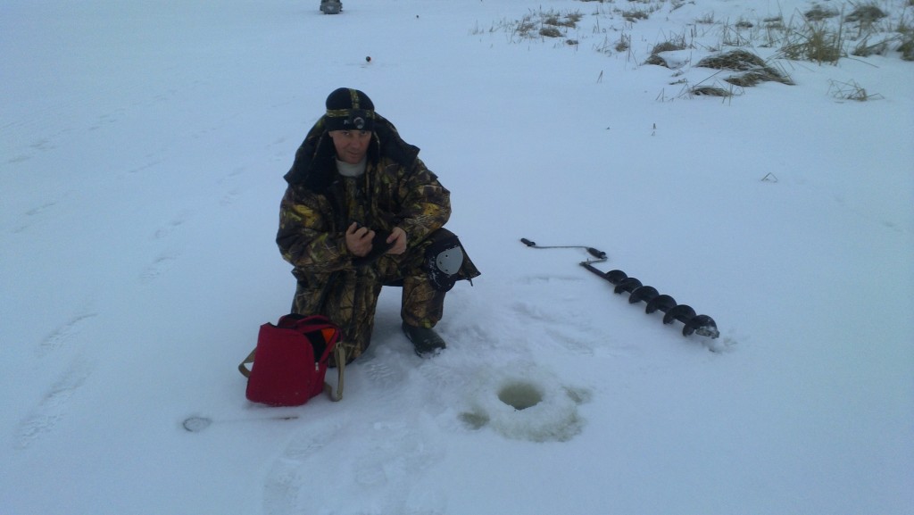 Бур в руках мастера не просто крутился - дымил от вращения, за короткое время набурив с десяток лунок Денис обучил меня азам подледного леда и побрел искать свою удачу. Сначало было как то непривычно маленькой удочкой махать и ждать, что кто то должен покусать приманку и непременно выскочить за ней из лунки. Время лова пошло, даже наверное полетело и вот радостный КРИК Дениса оповестил меня и близлежащие окраины, о том что та за которой мы приехали - поймалась.
