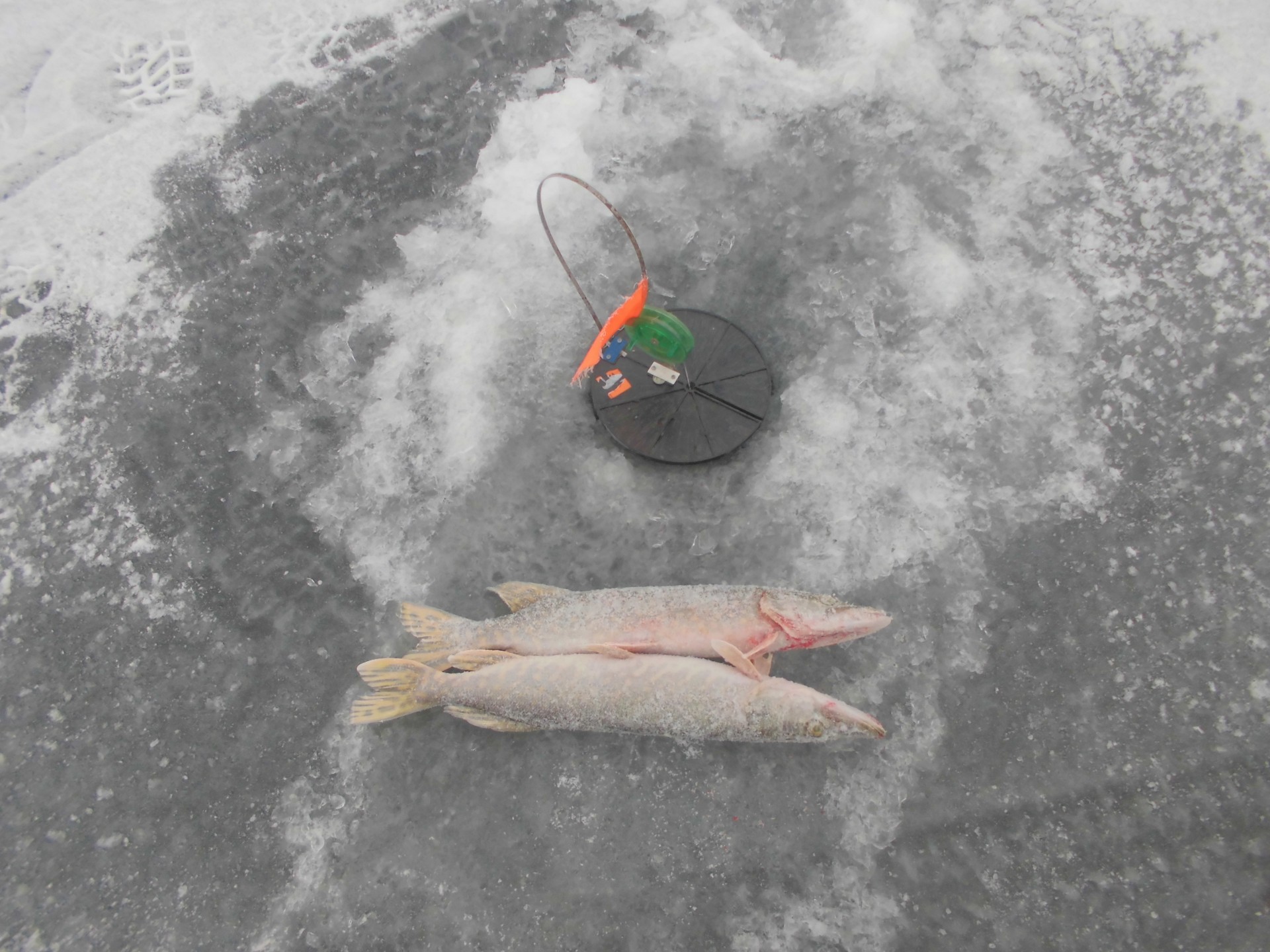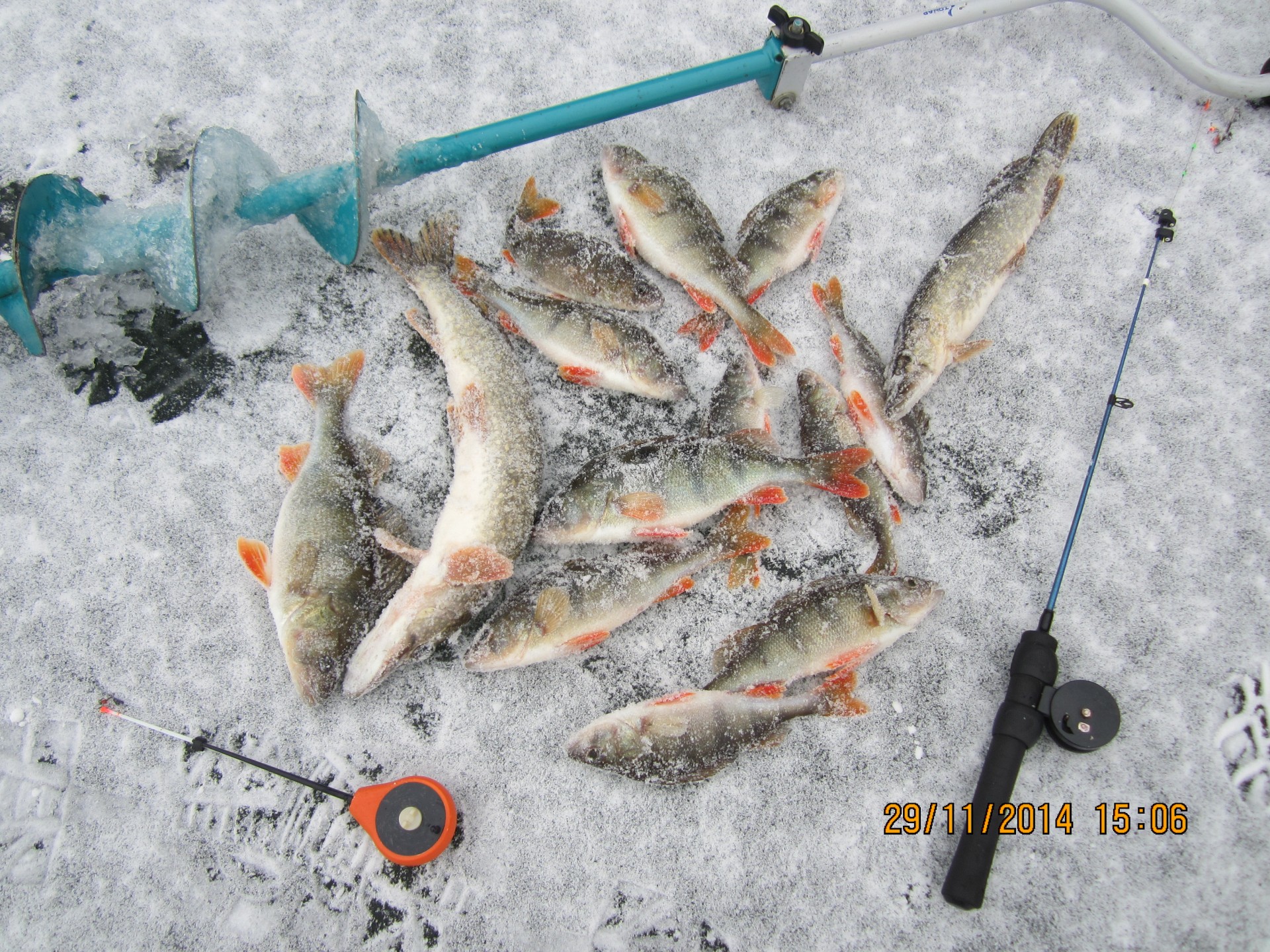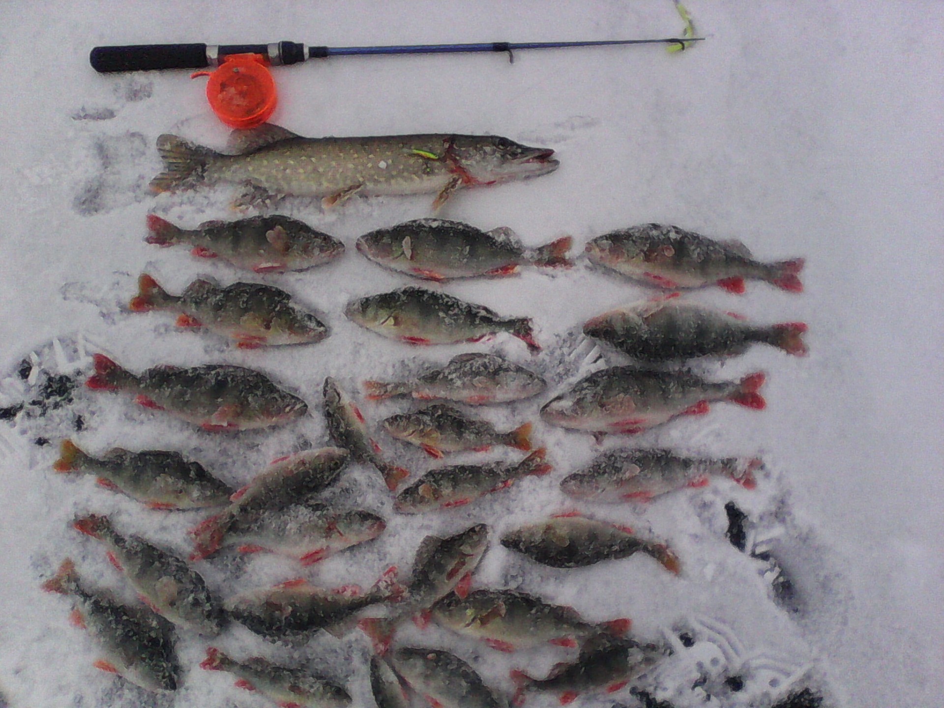 Так как все уже написано, немного добавлю от себя :^{Самый прикол ;D Я уходя на поиски окуня , ушёл от жерлиц своих и Денис вытащил на моей жерлице щуку, а я вытащил щуку на Серого инструмент , пока он разглядывал окуней в лунку. sm:4
