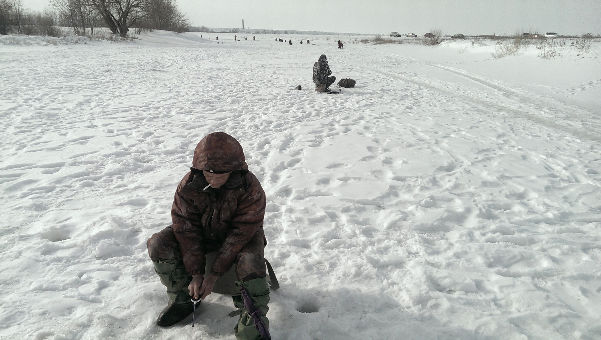 Плюс приехали на берег тогда, когда все рыбаки разошлись. В итоге валит снег - нашли снегоходные следы и пошли прямо ) Интузиазма было мало, т.к я слышал что шишки там на 8км удалении от берега.