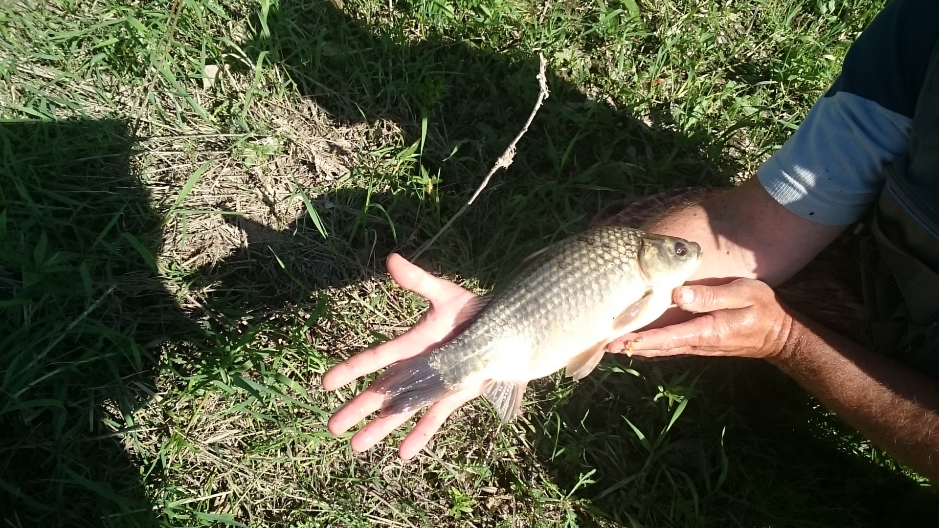 Наконец то нормальная поклевка и карасик на берегу.