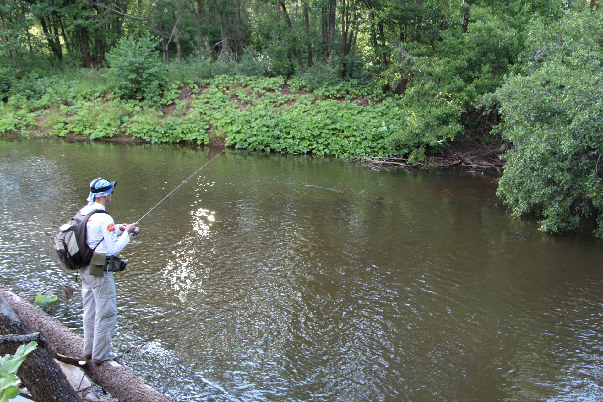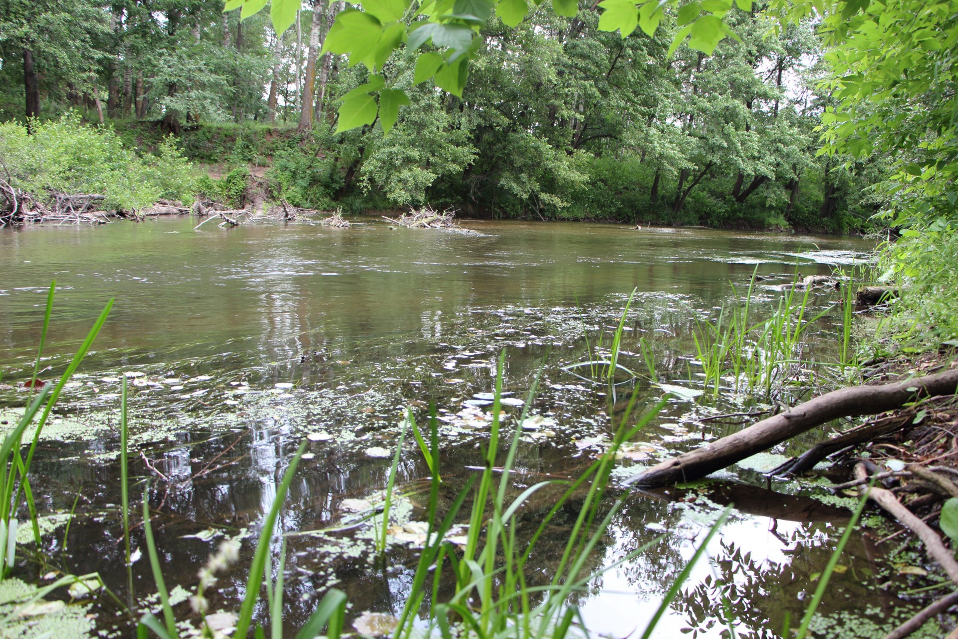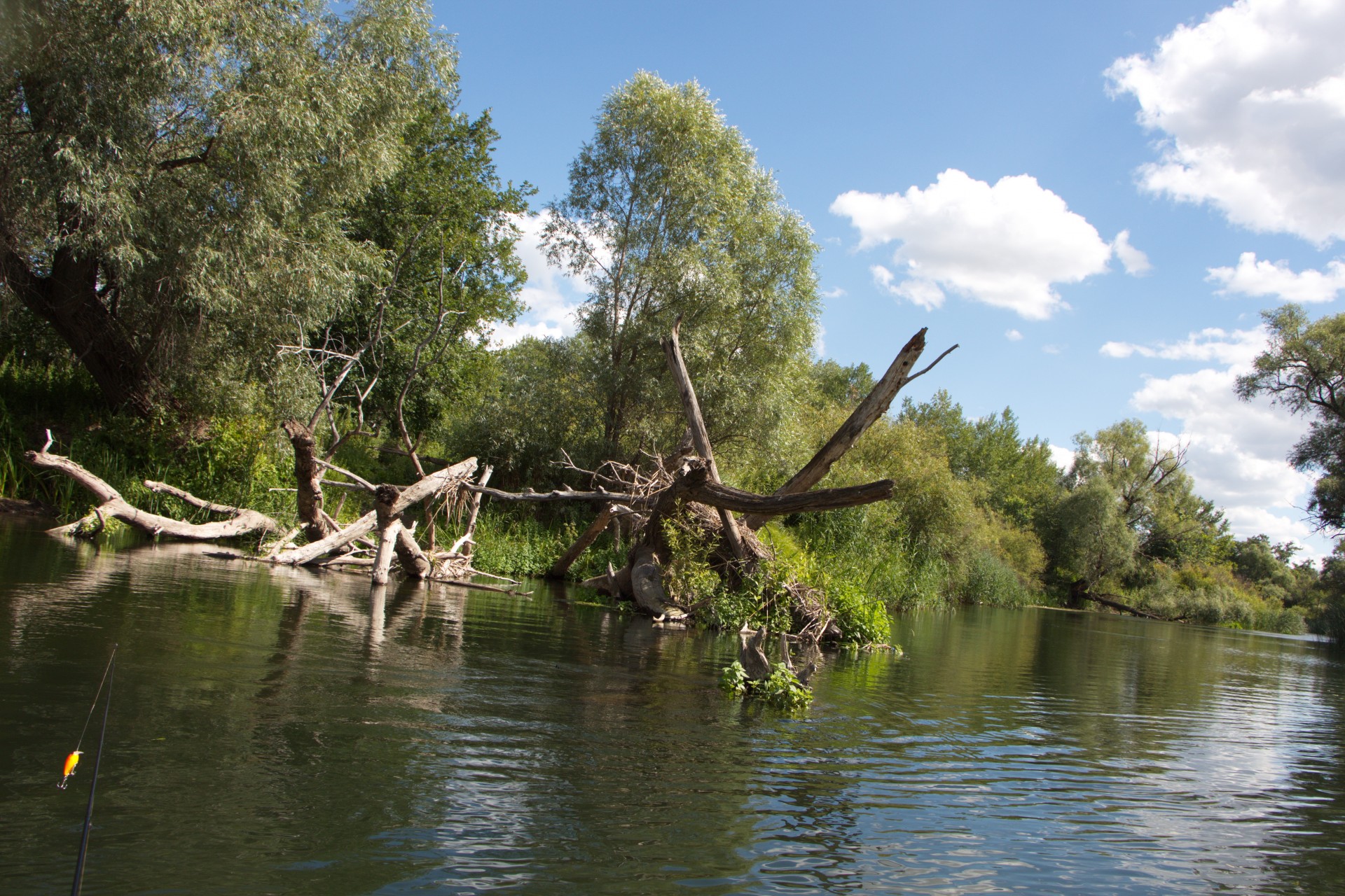 Под противоположным берегом небольшой куст нависал над водой. Кроме этого в этом месте образовалась зона обратного течения за небольшим мысом. Хорошее место!