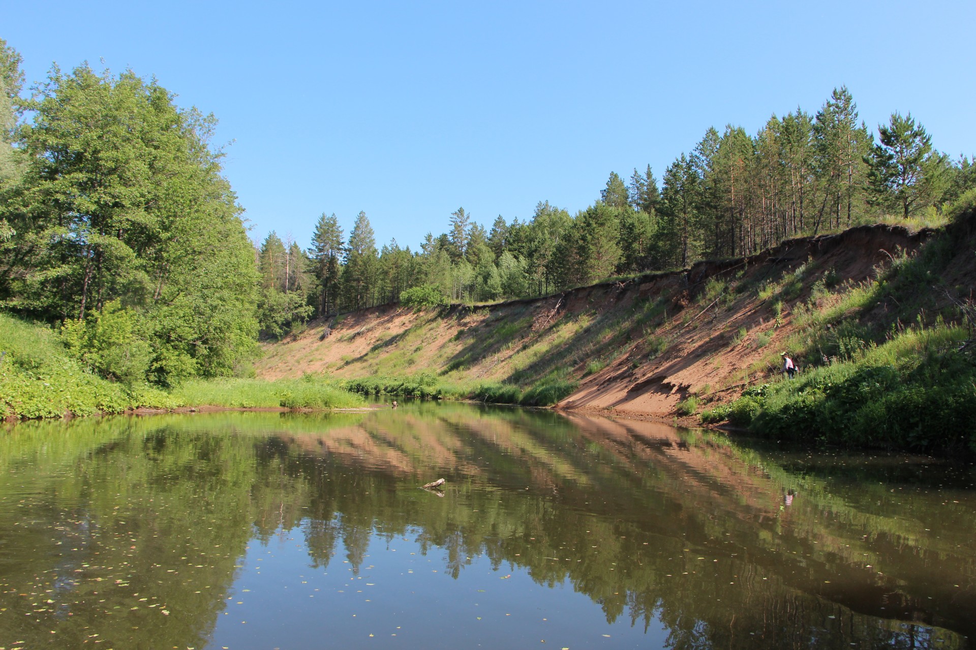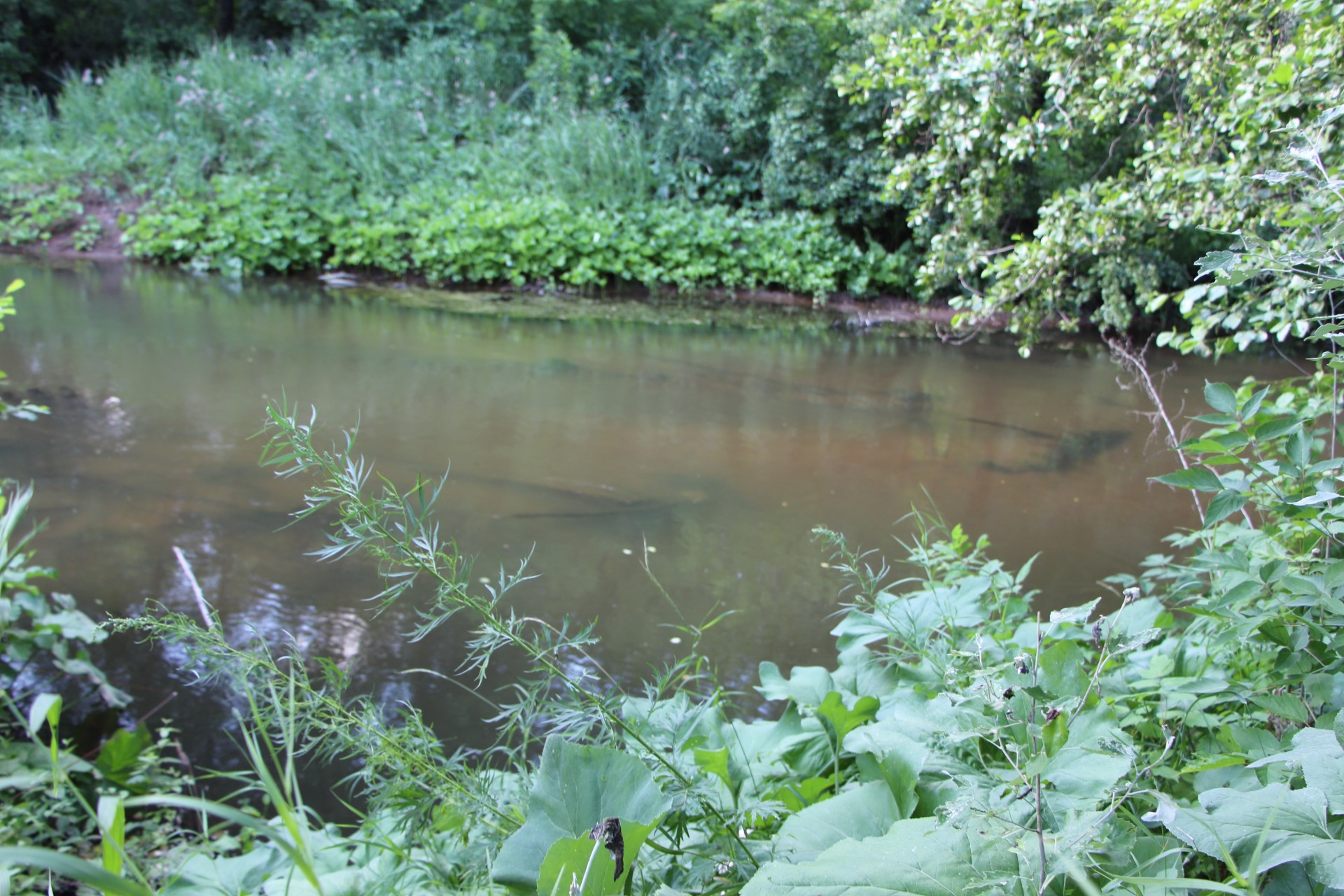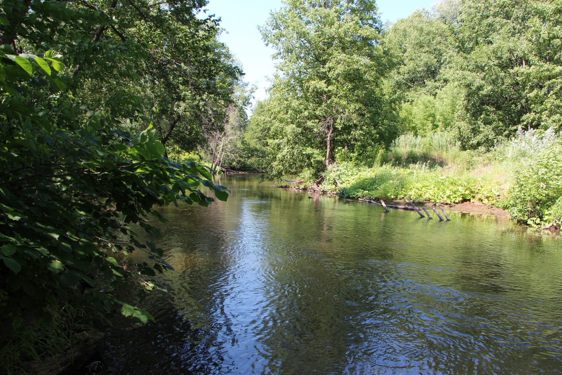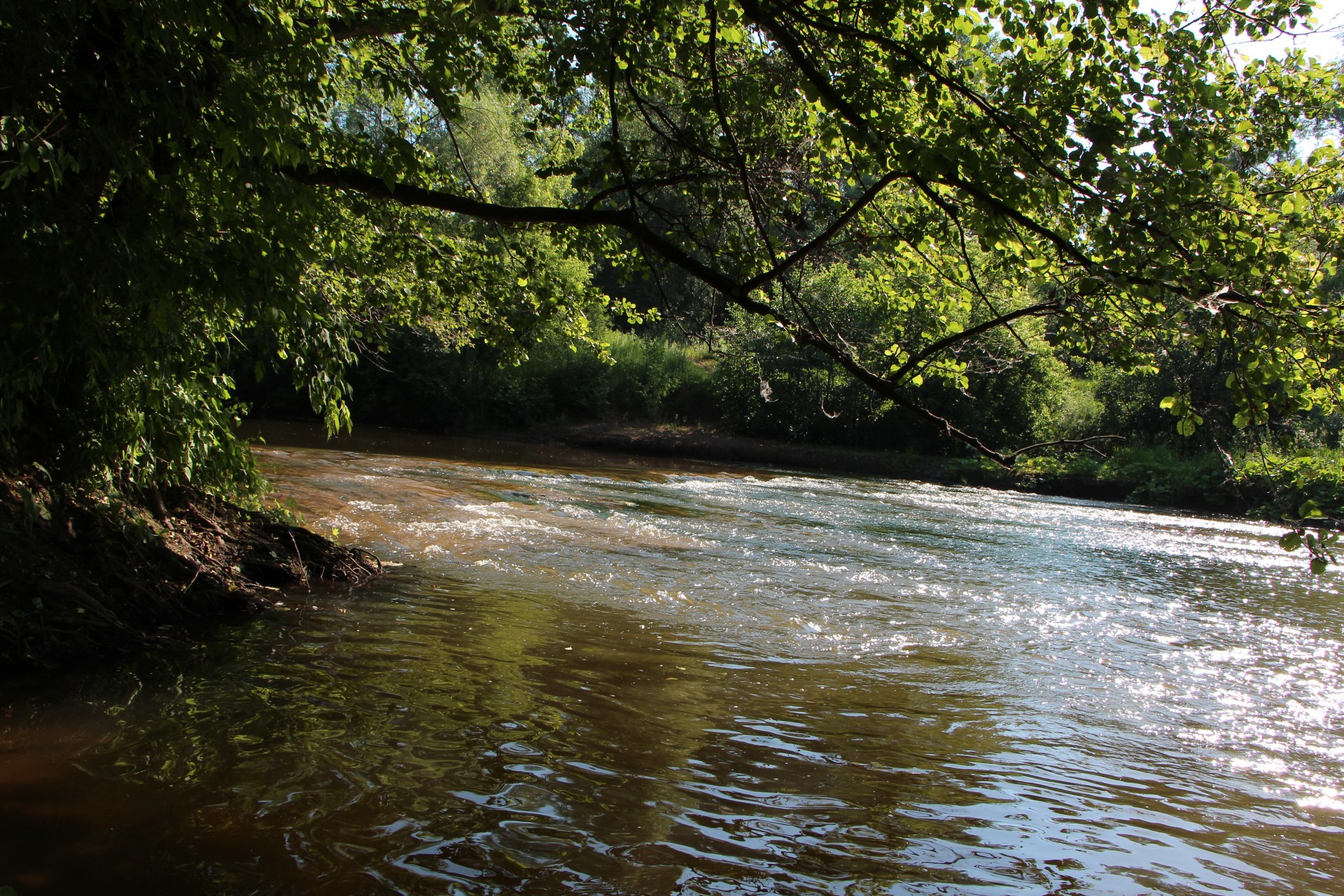 Под противоположным берегом небольшой куст нависал над водой. Кроме этого в этом месте образовалась зона обратного течения за небольшим мысом. Хорошее место!