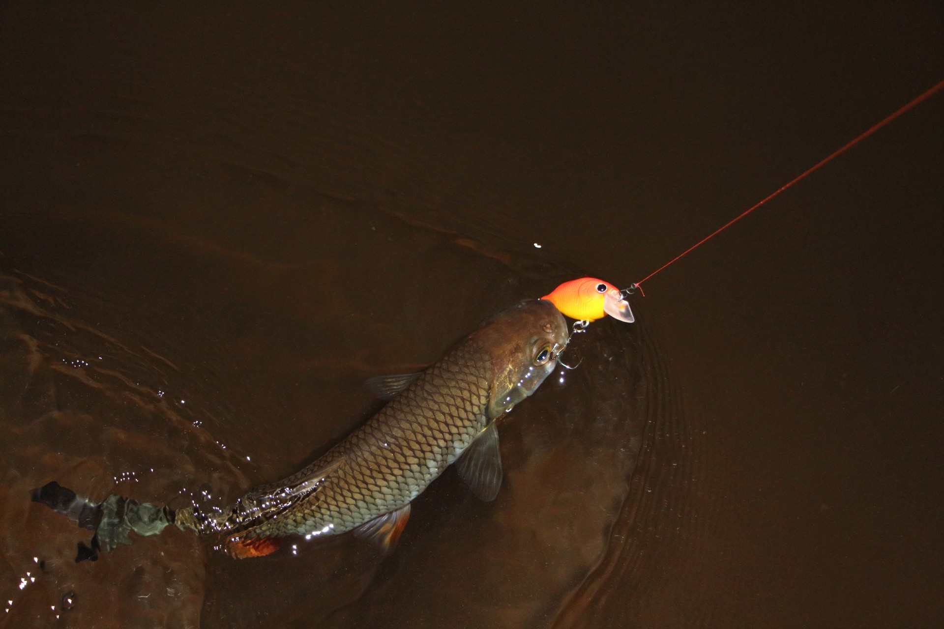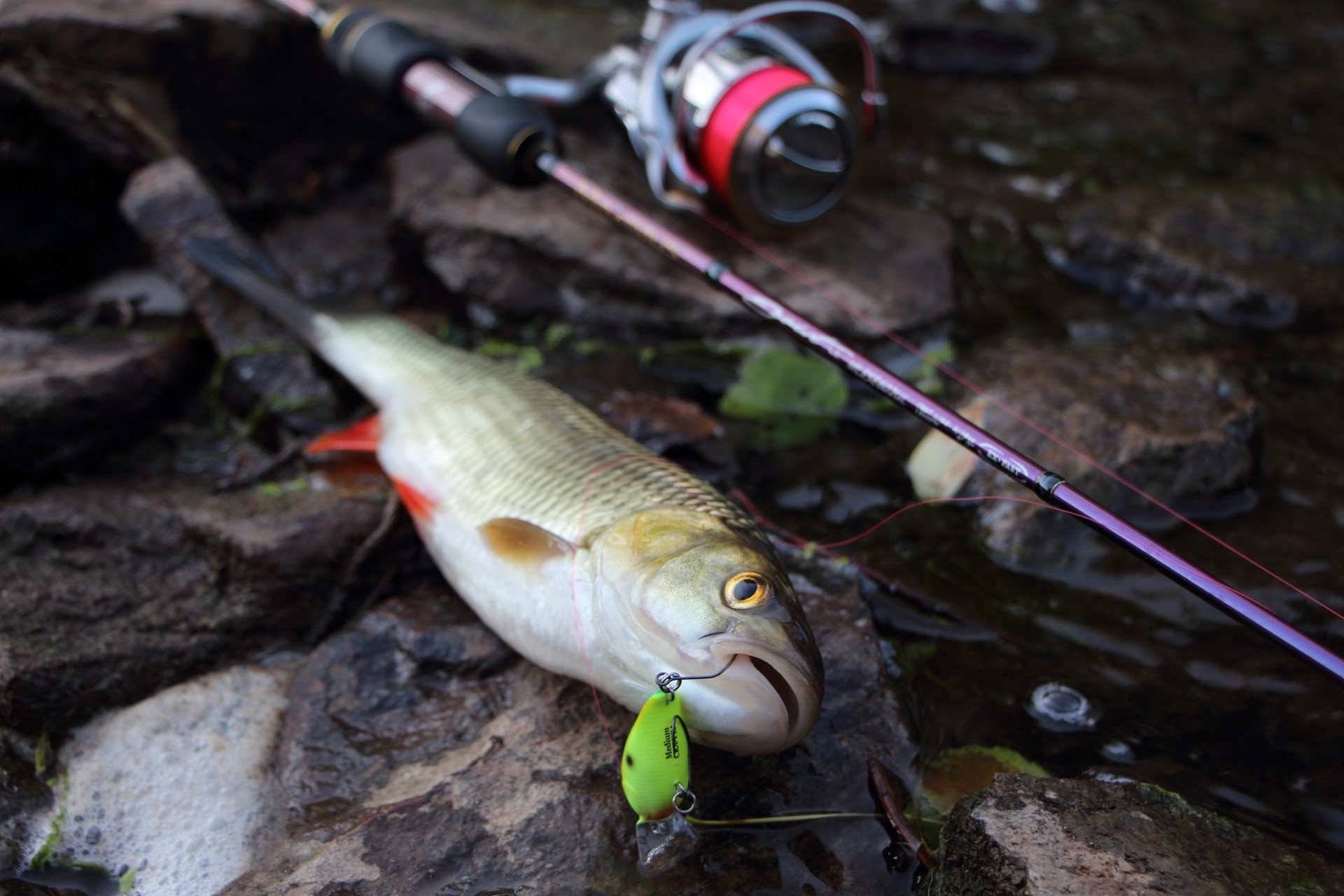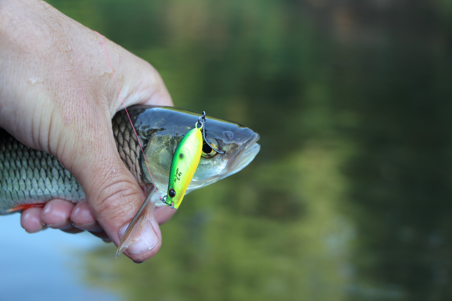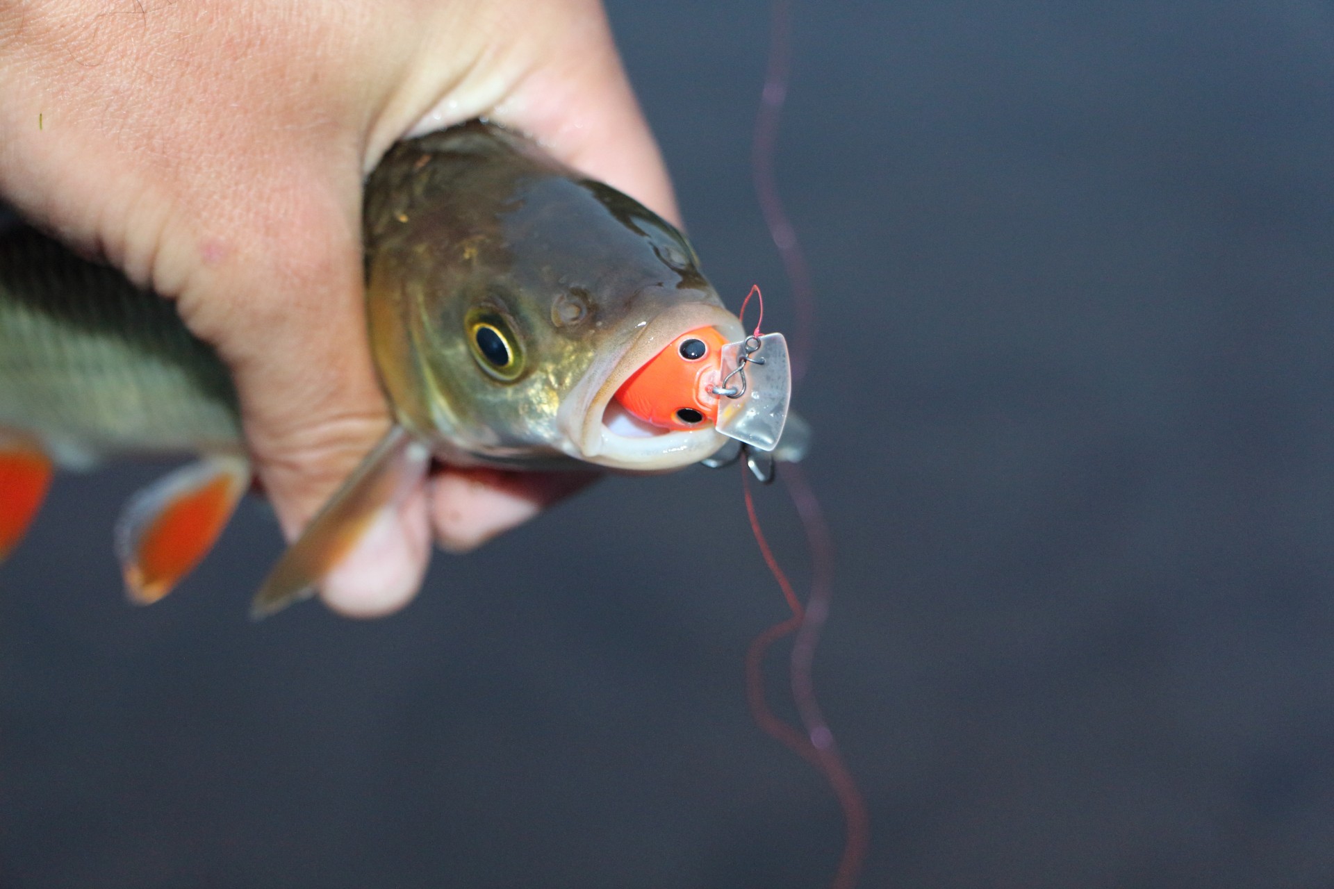 Ставлю S-Roller. Его без напряжения кладу уже точно под урез воды. Неспешная проводка. На выходе из обратки мощная поклевка. Красноперый красавец сделал еще пару рывков, сматывая леску. Снасть отрегулирована четко. Сойти не реально.