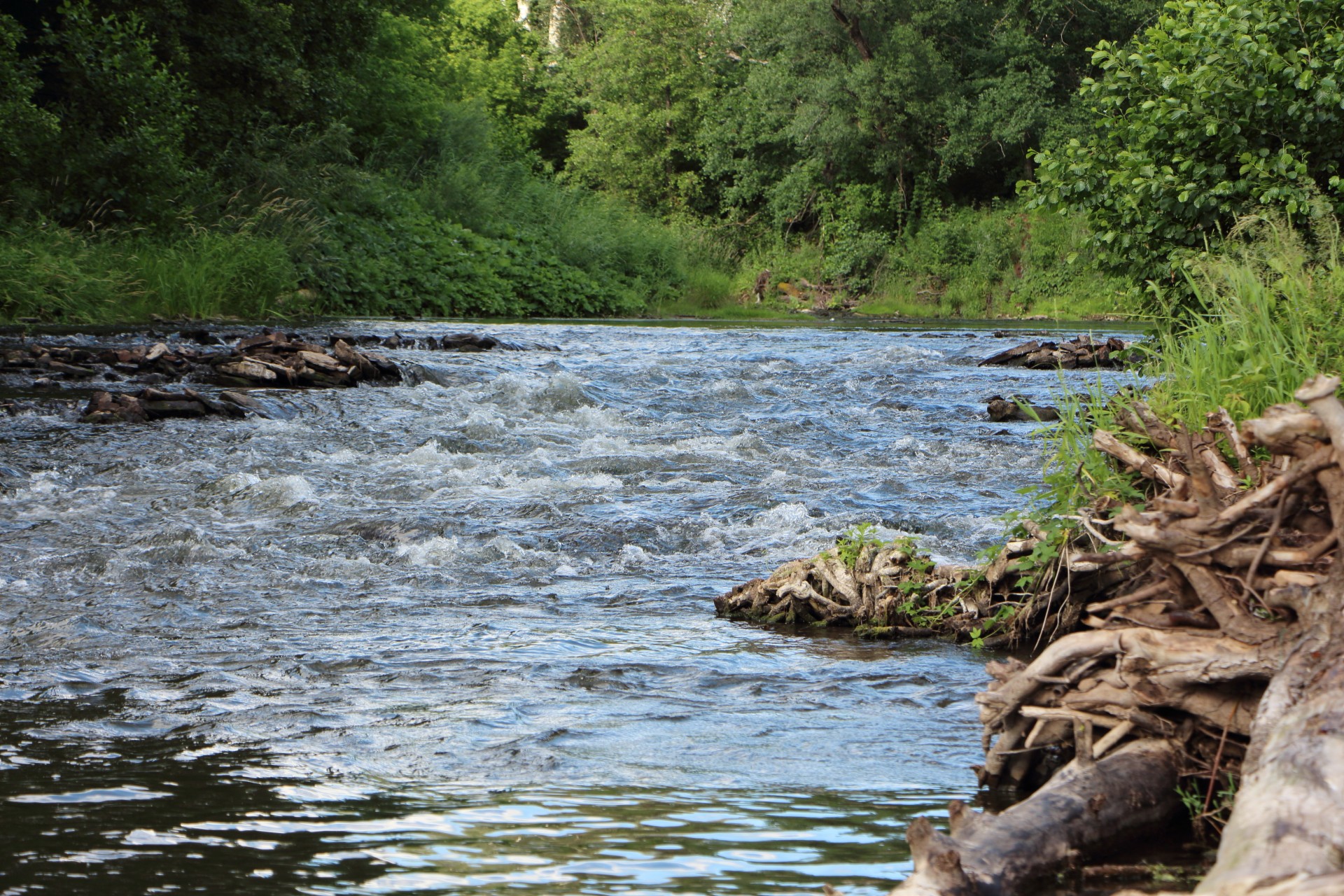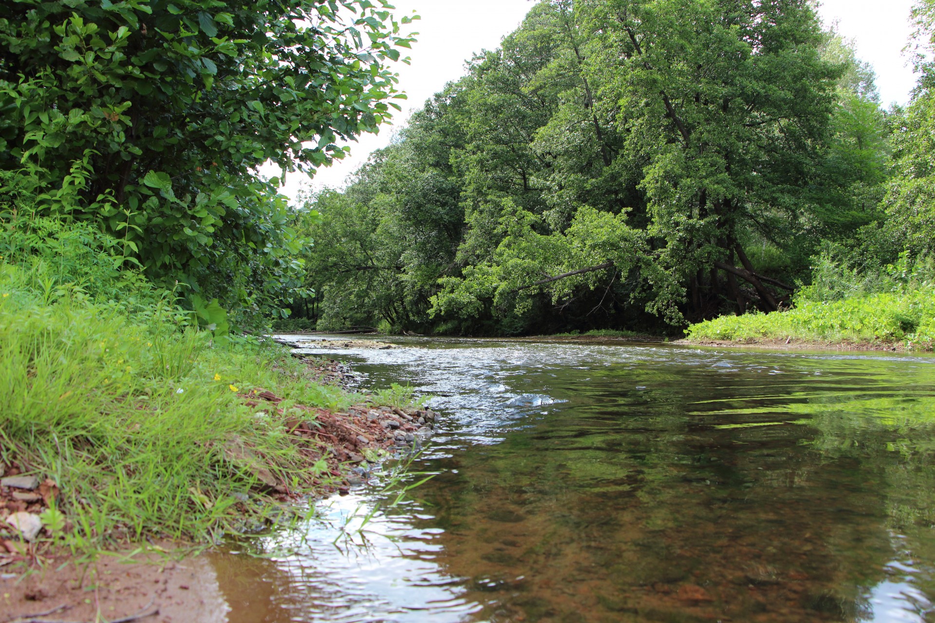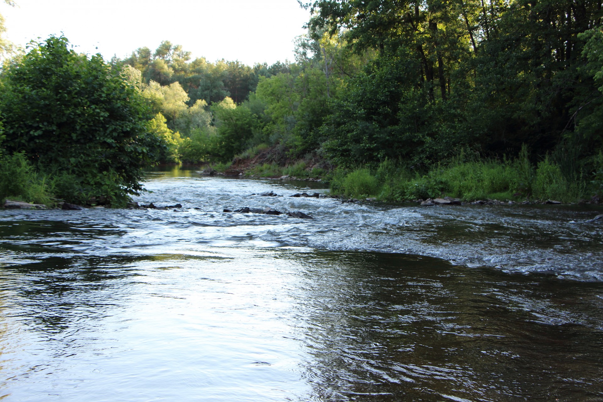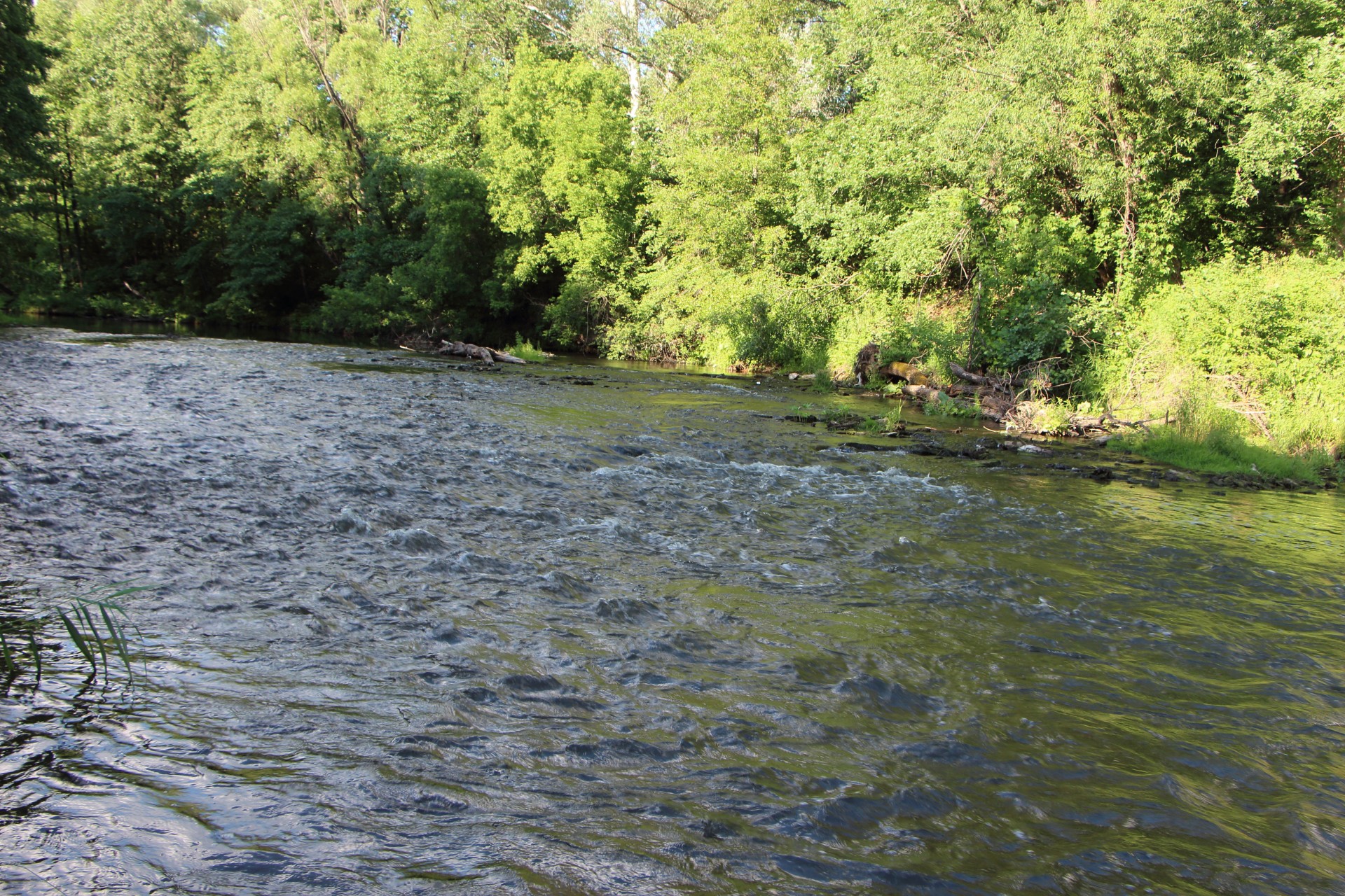 Спускаюсь ниже. Перкат с поросшими осококой берегами. Возле осоки тиховодье. Ставлю Bevy Minnow 40SP, чтобы обловить и перекат и тиводье сразу.