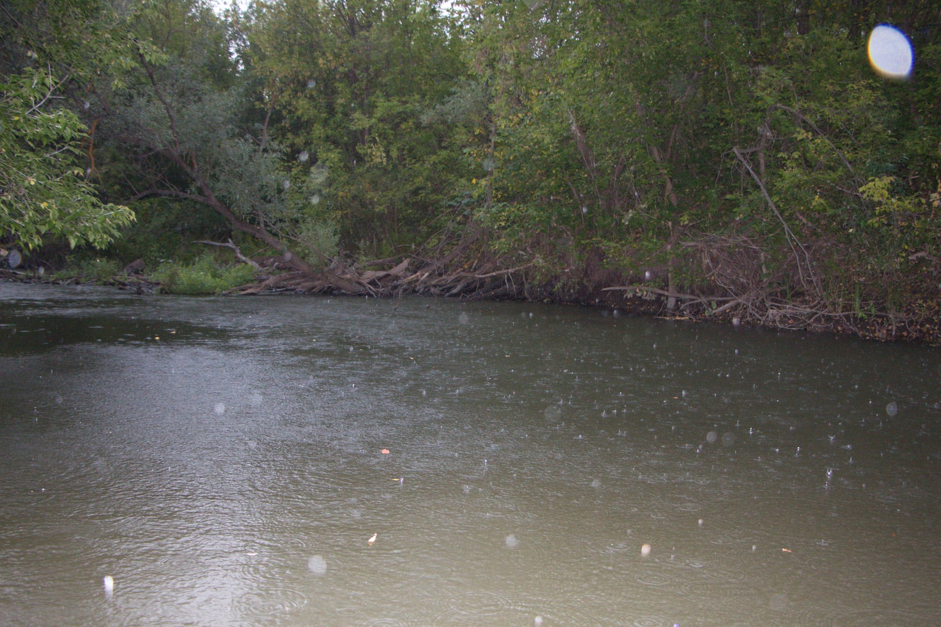 Щучки клевали исправно, но в середине сплава шарахнул такой ливень, что в лодке стала заметно прибывать вода. От сильного дождя, мой старый мембранный костюмчик уже не справлялся. Дал течь по швам :(