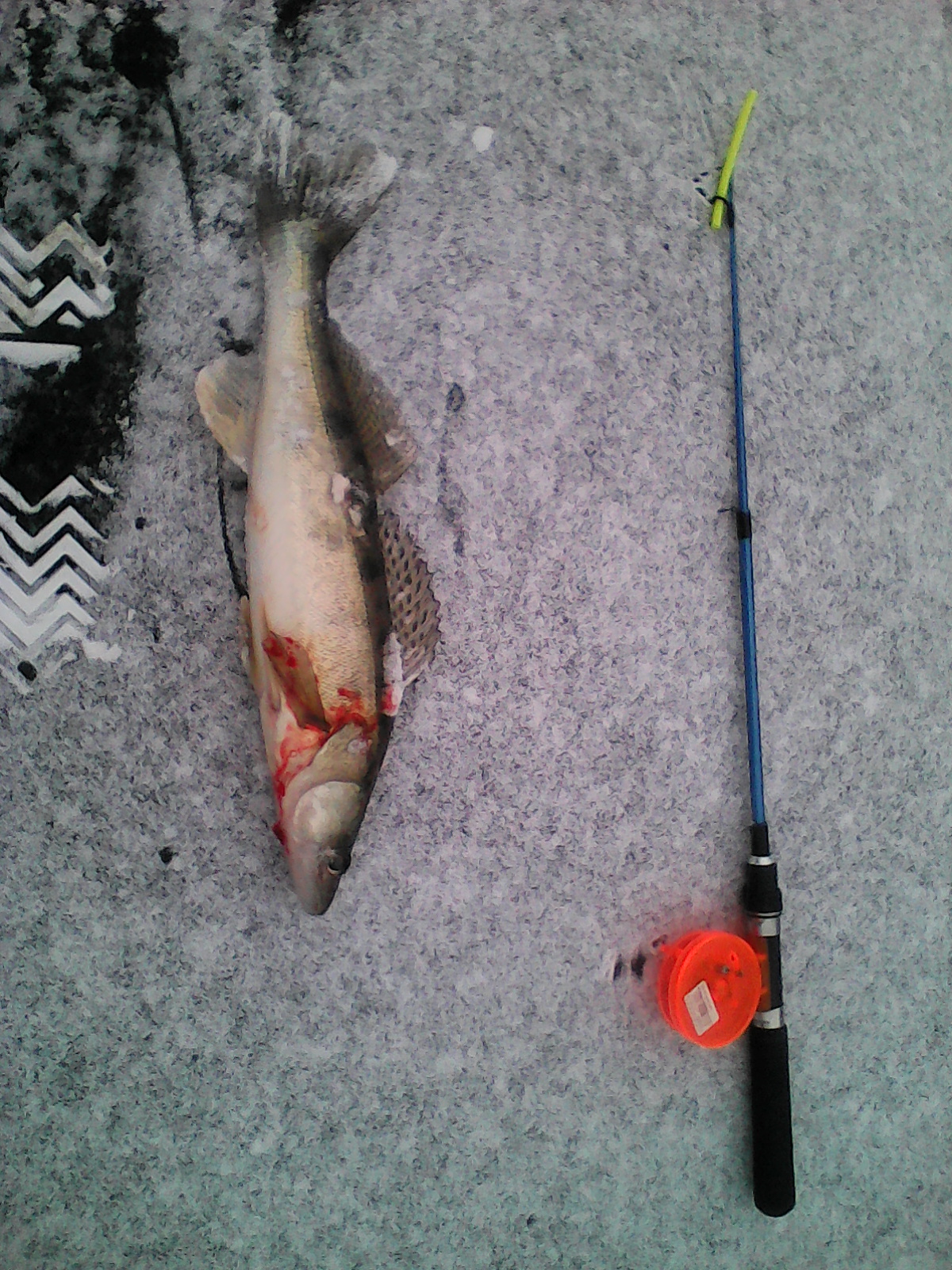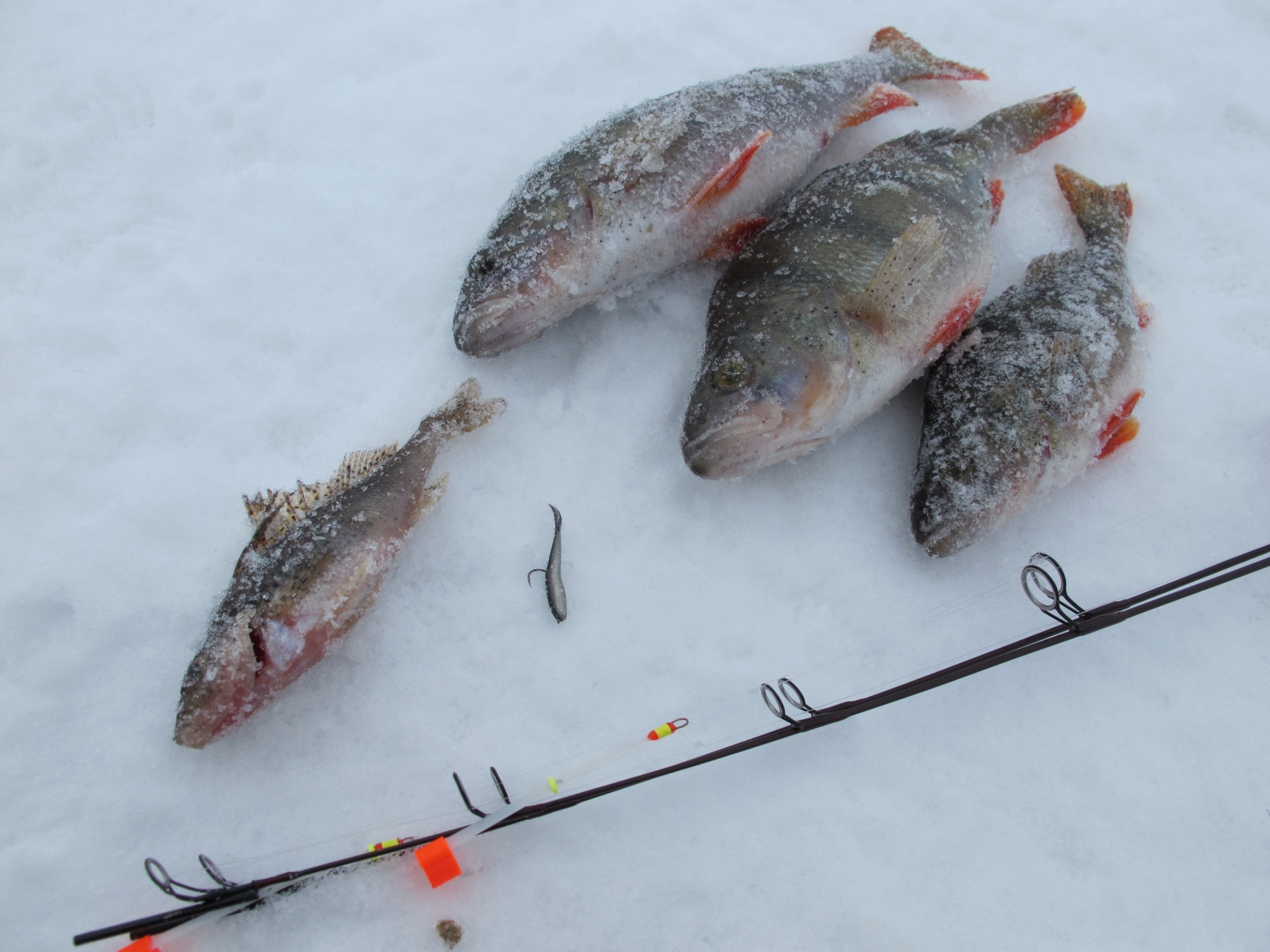 Озеро Долгое,десяток ротанчиков 15-20см. на мормышку с подсадкой куриной шкурки.Лёд со снегом 4-5см. глубина 60-70см.
