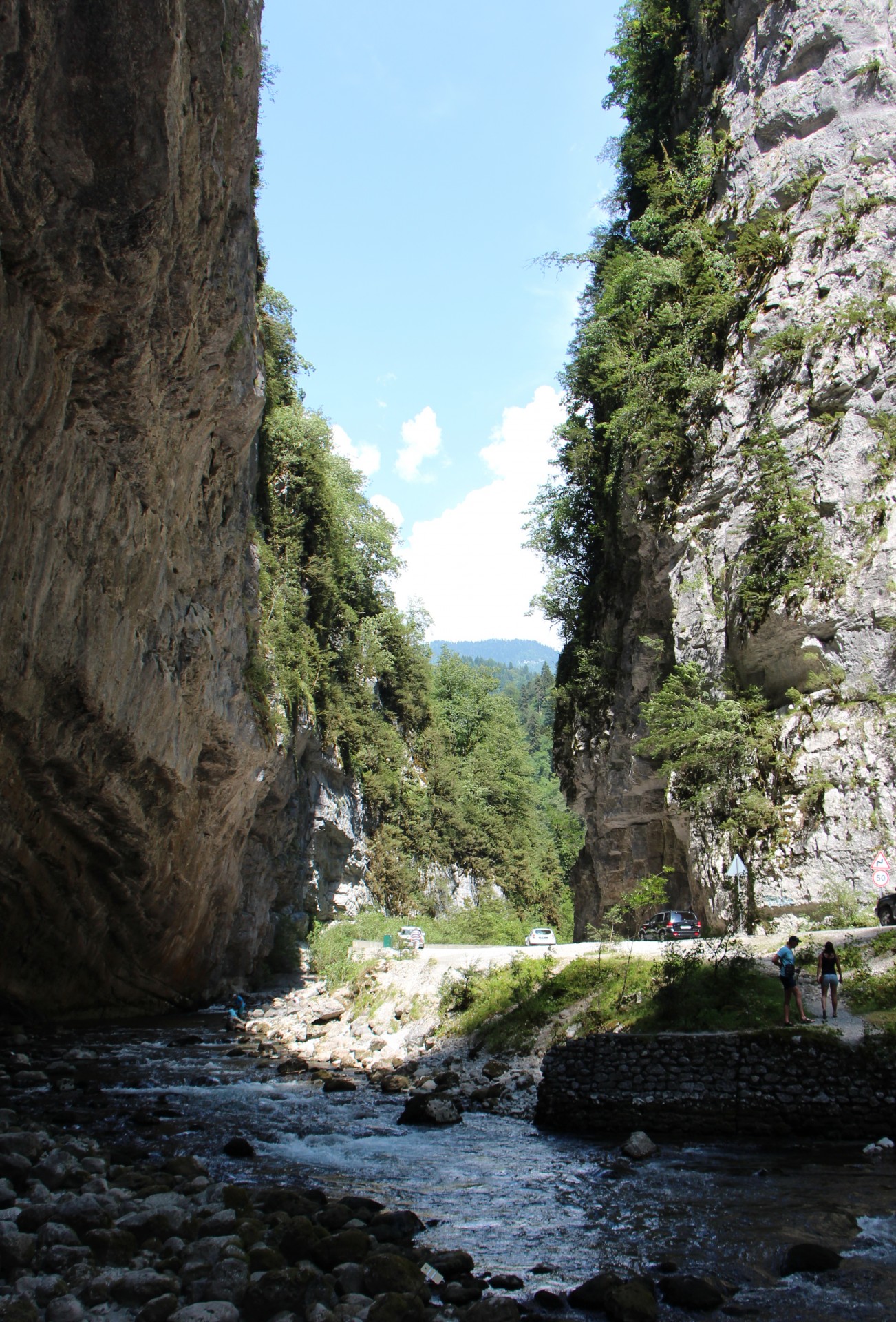 Красивейшее место! Со всех сторон реку окружают скалы заросшие лесом. По берегам разбросаны огромные валуны. Чтобы увидеть небо голову нужно запрокинуть. Настолько глубокое тут ущелье и круты его обрывы.