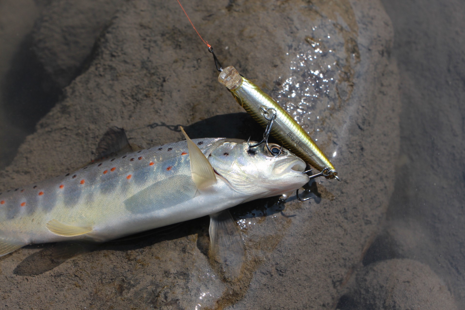 Меняю приманку на тонущий минноу. Проводка вдоль камешков с периодической отдачей вершинки спиннинга. Приманка играет на одном месте, подхваченная течением. Есть!