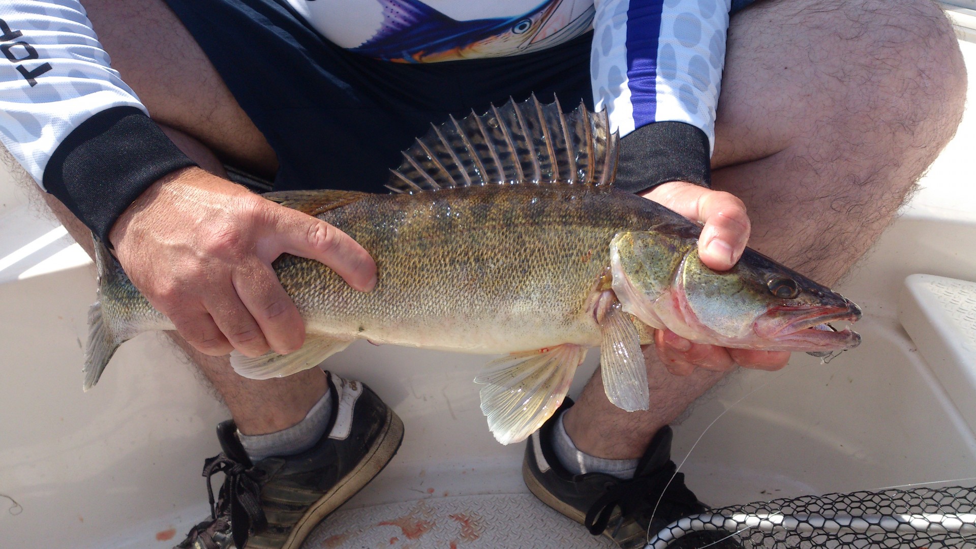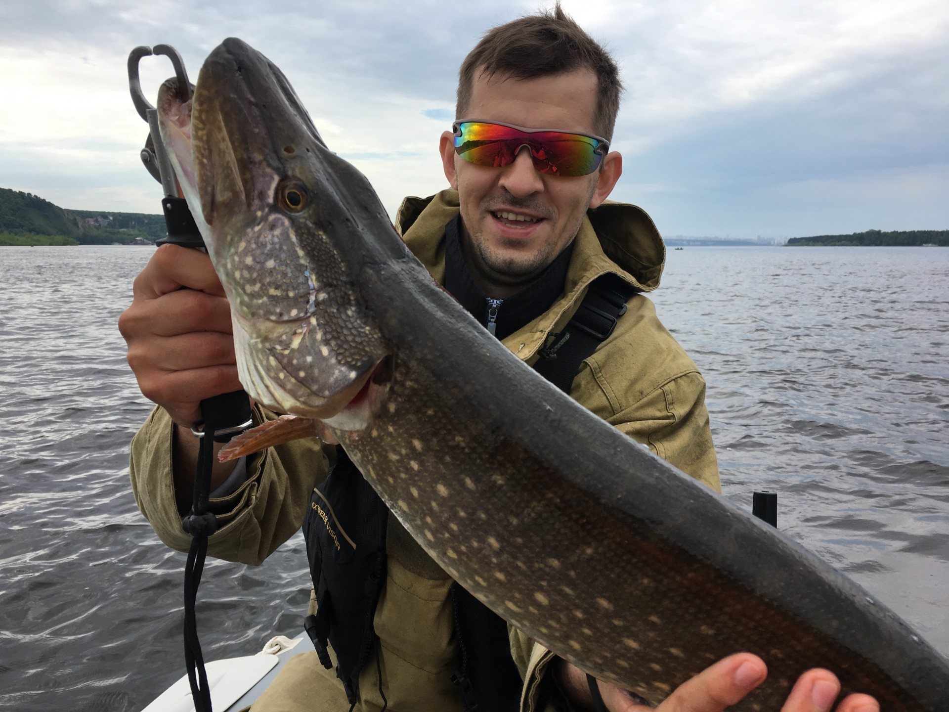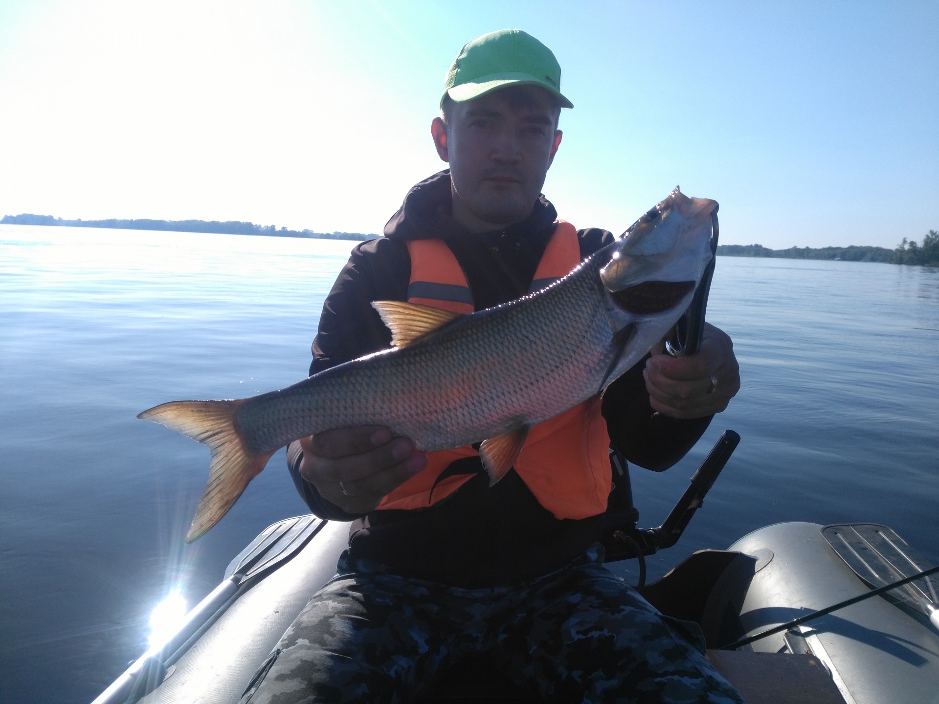 Ходили c другом тестировать его новый эхолот Lowrance Elite 7ti, Но так как уже с вечера начали его обмывать [smile=beer2] , то утром было [ssm31] и в лодку кроме меня спиннинг никто не взял. Вышли когда было совсем светло. После некоторого шатаниям по бровкам и разглядывания красивых картинок на экране эхолота, была замечена стая чаек кружащих над меляком. Подходим ближе и видим редкие всплески, ну думаю "окунь то по любому тут будет". Цепляю "крылатку" 5гр., заброс, проводка, потяжка, мелкоокунь... Еще заброс, уже поболе окунь, с ладонь. Тишина, сидим качаемся на волнах [ssm31]. Опять всплеск, заброс чуть дальше всплеска, хорошо летит крылатка. Мощная потяжка и давит в глубину... Фрикцион визжит, палка в дугу. Крупняк думаю, а подсака то нет, в машине остался (когда беру с собой всегда пусто). Достаю липгрип, будем брать так. Как стал подходить ближе... да это кит... Было еще видео снятое другом, но там придется все запикать. Как только он глотанул воздуха стал сдаваться. Приманка глубоко в глотке, на поводке расстегнулся карабин, дал бы слабину и он ушел бы. Затащили в лодку и на берег, на фото сессию. Жерех ровно 3.5кг.