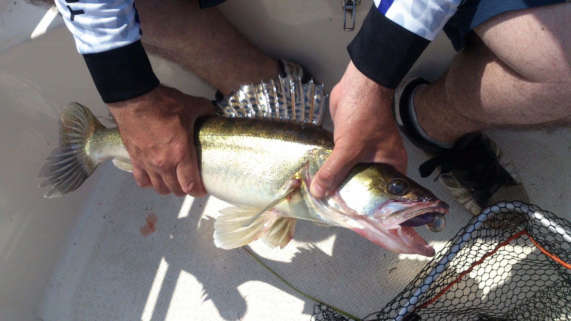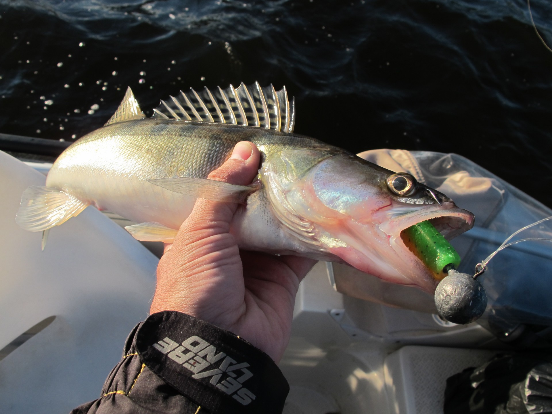 Вчера продолжили разговоривать с сомами посредством гидроакустических приемов))) Подъемов было много, но всю рыбалку испортил ветер. Водяной парус не справлялся со своей задачей в должной мере и с экрана сонара сначала медленно, а потом окончательно, пропали все сигналы приманок)) В итоге дошло до того, что поднимающегося сома на сонаре видно, а приманок нет)) То есть рыба, как бы под лодкой и все хорошо, а приманки парят где то сбоку, непонятно на каком расстоянии и не понятно на какой глубине. В общем, немного помучились и решили, что наверное, сезон квоченья в этом году окончен))) Ну и тут конечно вспомнили, что давненько не ловили судака))) Даже не пытались почти)) Легкий джиг 4-5 грамм на глубинах 3.5 - 5 метров.