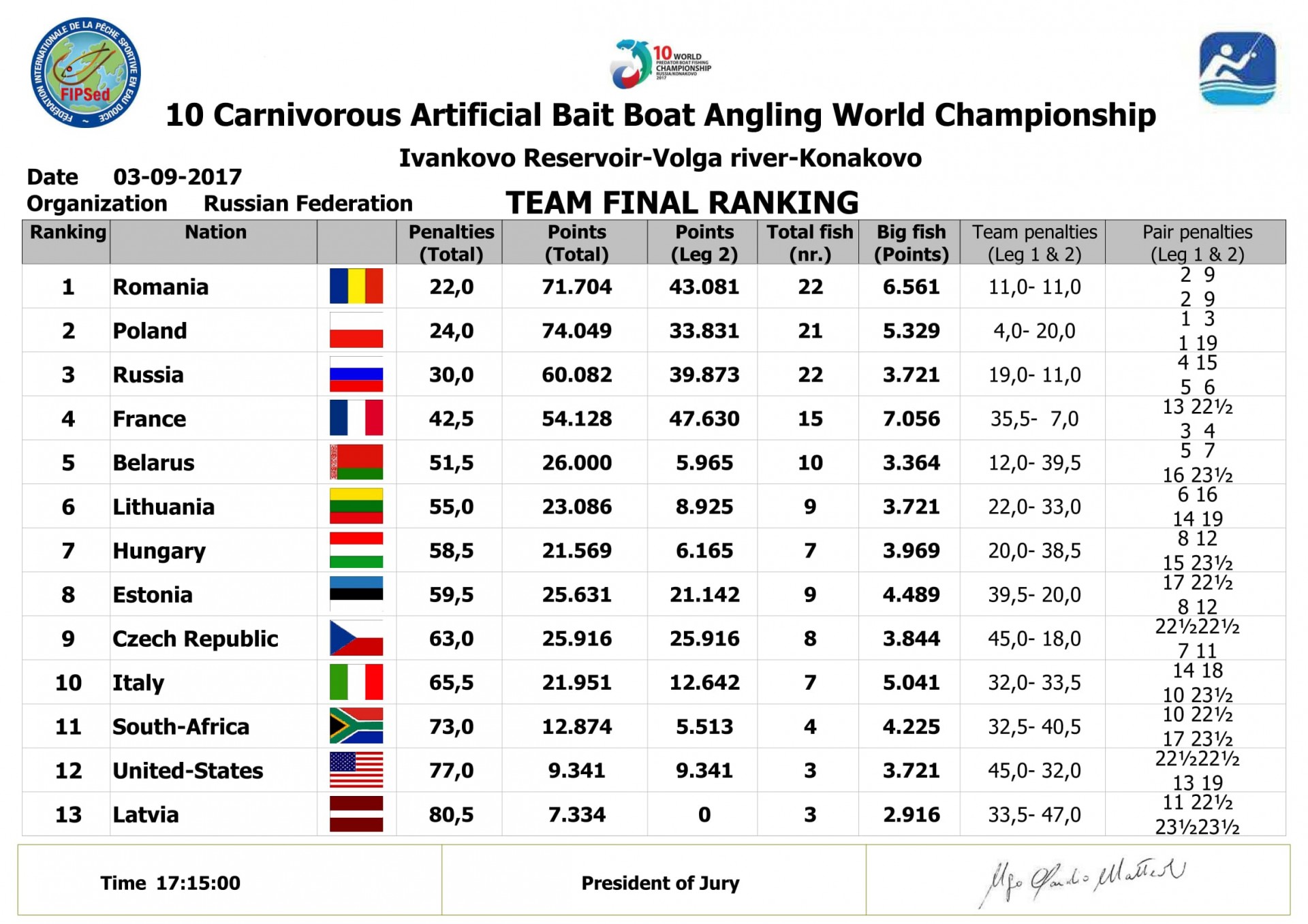 Финишируем примерно в середине турнирной таблицы. Дима с Сережей выступают стабильно, финишируя на 4м месте с пятью рыбами, четыре из которых щуки. Первые в паре поляки. У них шесть щук. Они же возглавили командный зачет, за ними Румыния, затем Беларусь и мы четвертые.