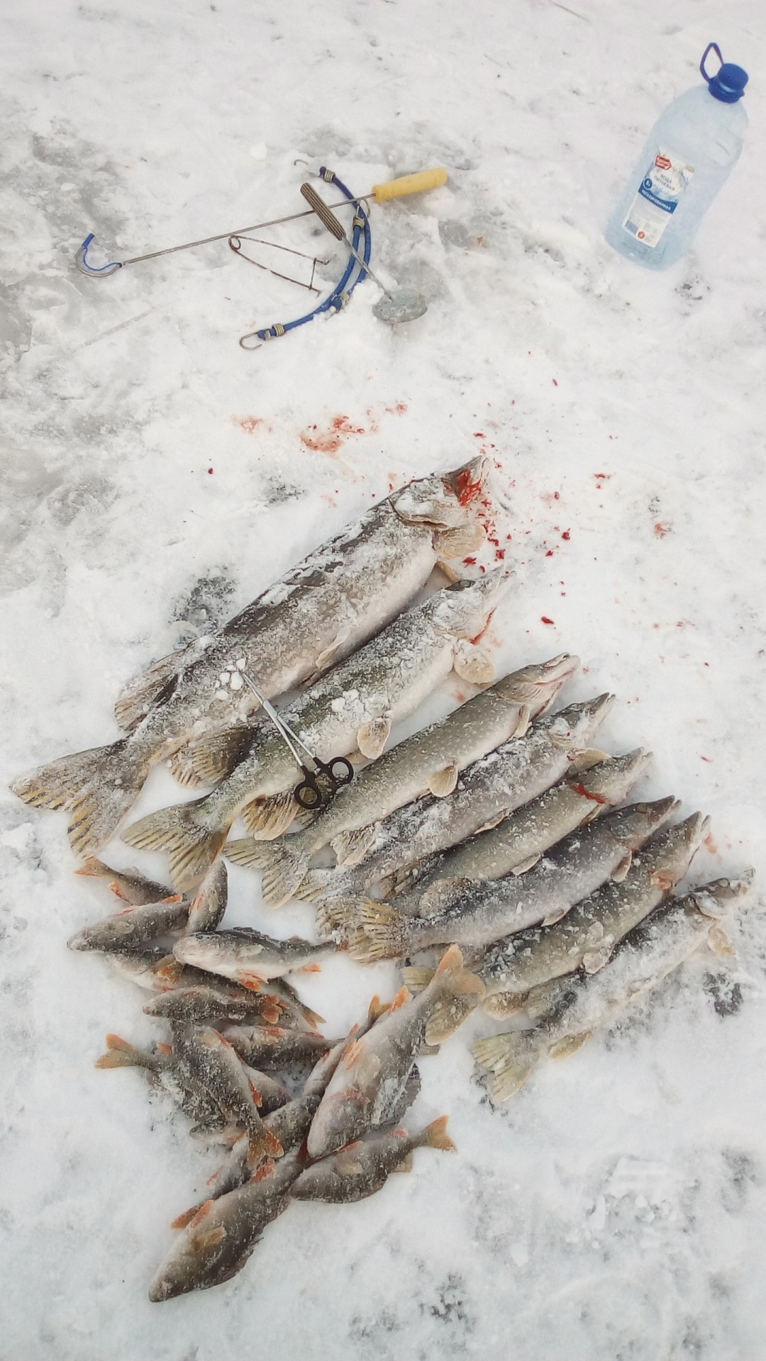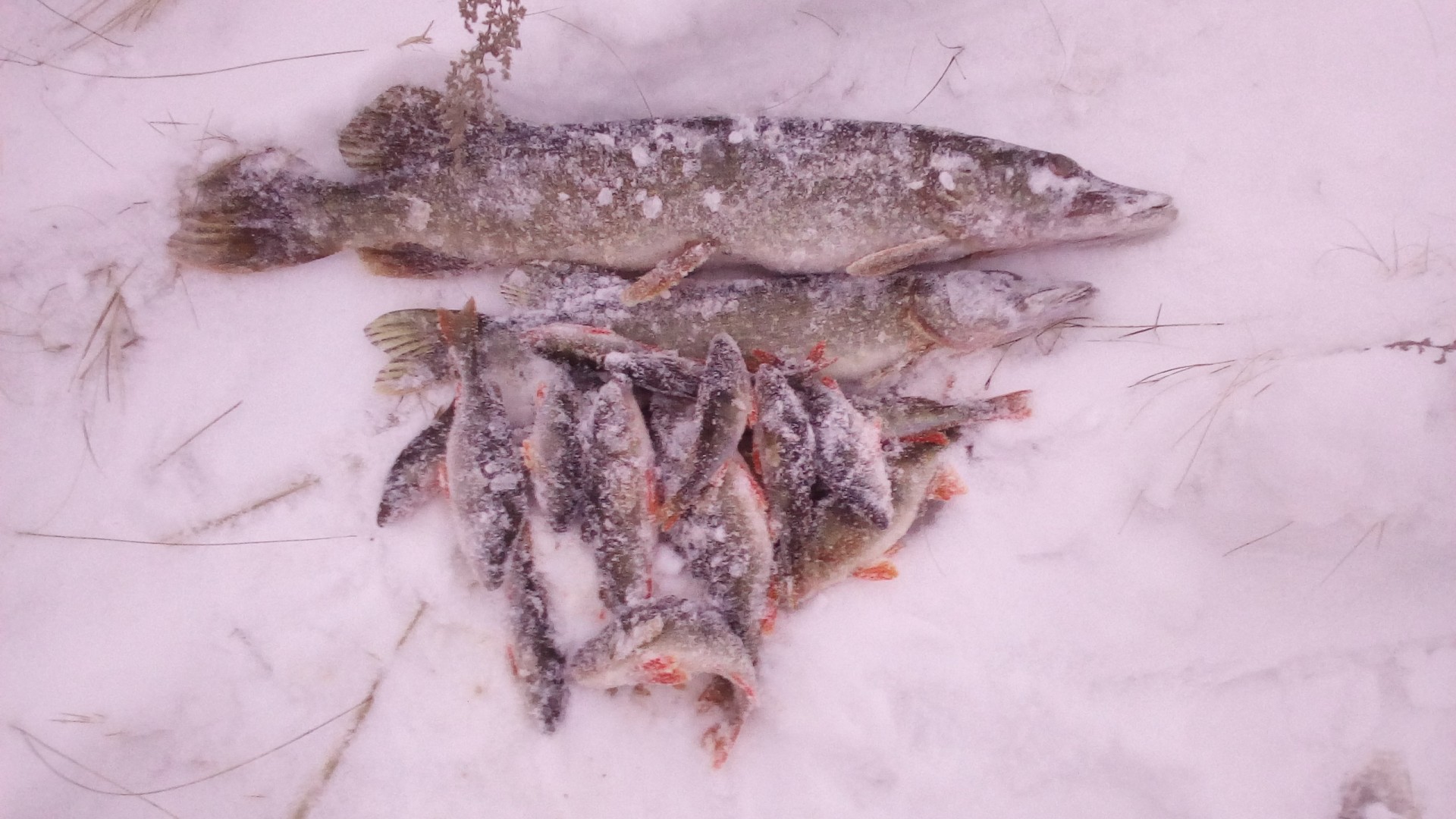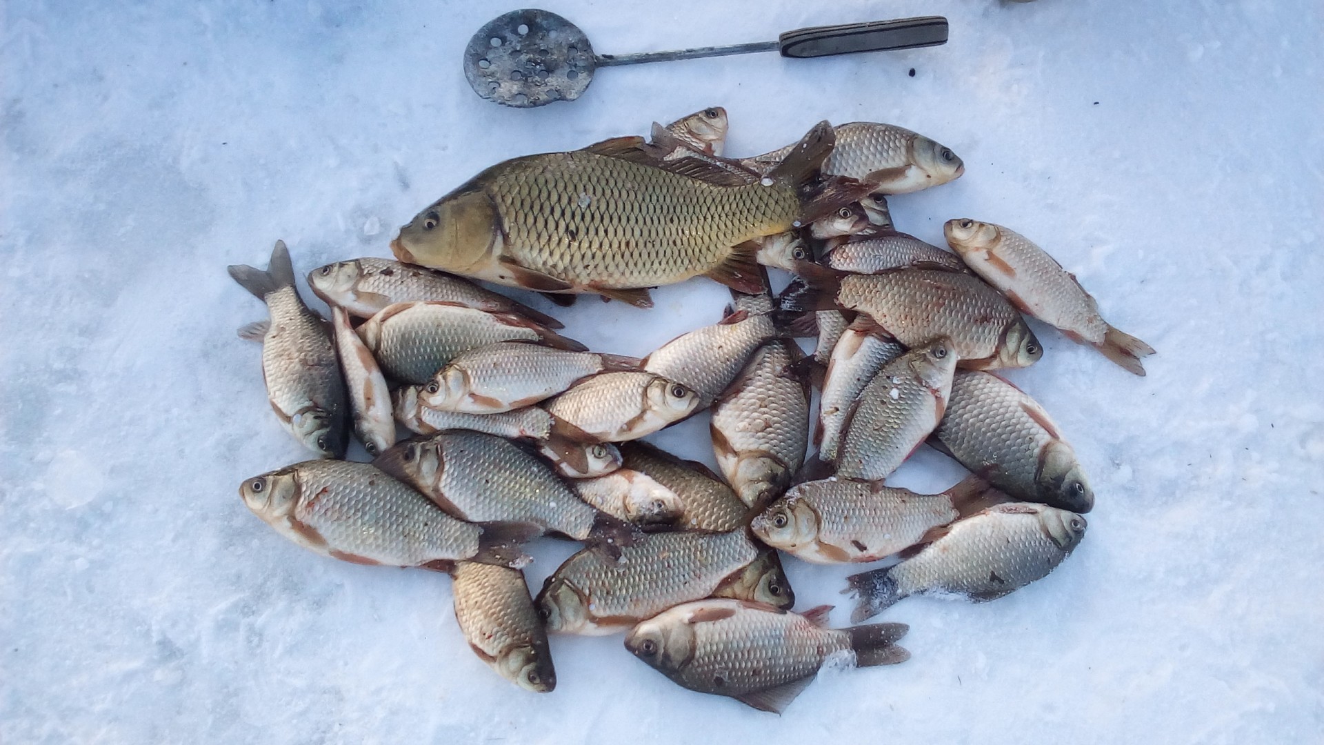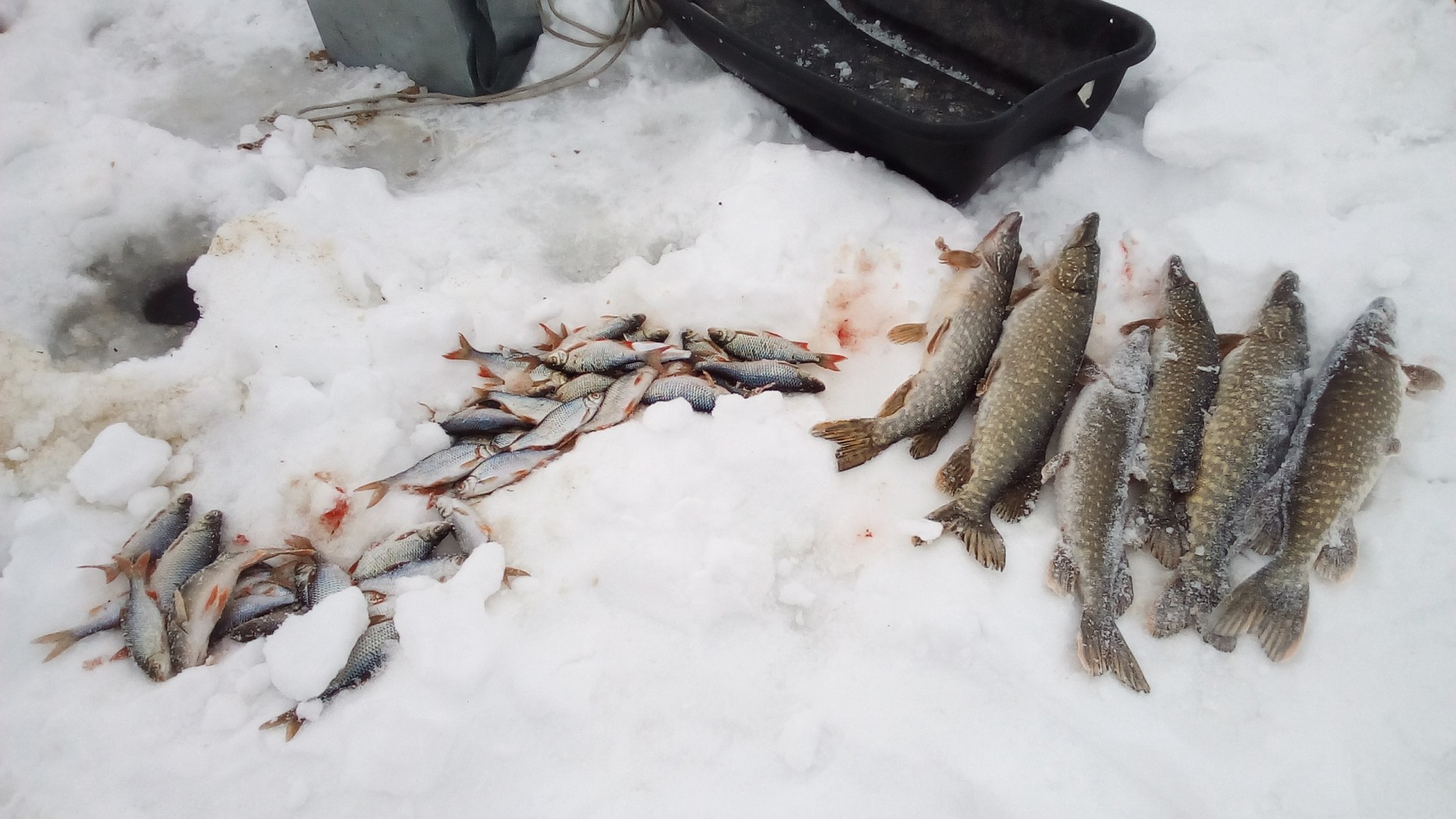 В субботу привычной компанией были на рыбалке, на Волге, в Петровском затоне. Видимо попали на "слом" погоды, было морозно, ветра не было, но и мороз не падал. Ловили плотву и густеру. Все отловились по- разному: ко-то больше, кто-то меньше, я поймал 3-и с небольшим кг. Ловил на мотыля, на донки, на арбалет. Время провели замечательно, рыбы наловили-что еще надо для счастливой старости? Правильно-денег побольше. Есть возражения?Да, место начинает понемногу капризничать. Сидим буквально в 10 метрах - у меня 7,8 кг (удивительное совпадение с Отморозком, правда по времени ловил меньше), у у друга и трех нет. Ну он расстроился, говорит давай поедем хоть окуней половим и живца(собирались за щукой, карасей как известно нигде нет. Где их кстати Гончаров берет - опять секрет). Ну и по окуню у друга не срослось - опять 10 метров между лунками, у меня штук 10 в районе 150 грамм, у него один живец. Ну не надо было говорить, что за ним едешь. Ну смех и грех , одним словом. Не его день. По щуке, кстати в воскресенье не очень. Две в районе двух кг. Но правда 4 схода чего то некрупного. Последовали совету ставить крупного живца. И вот результат.