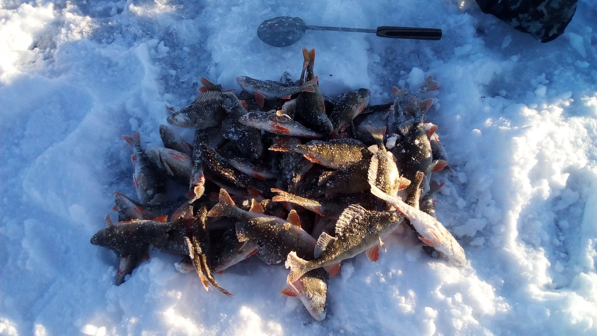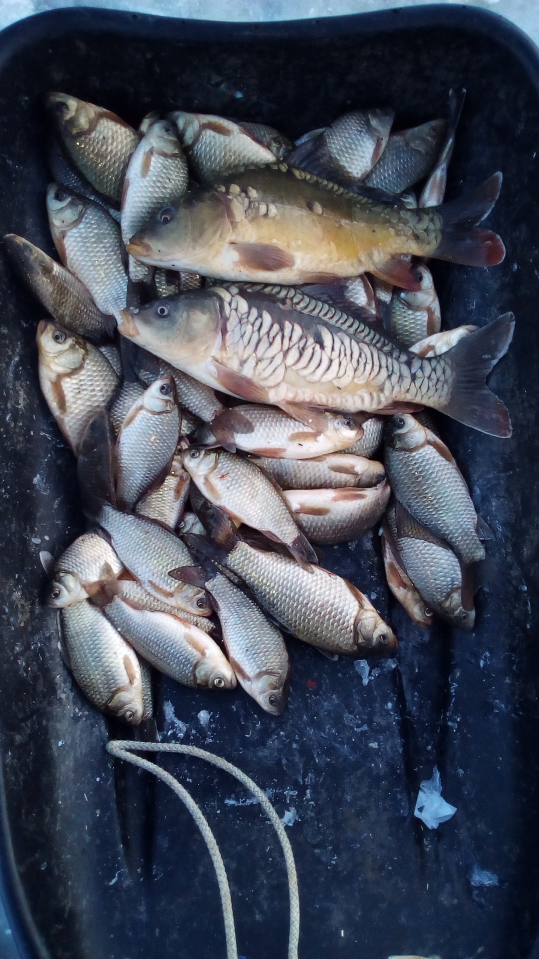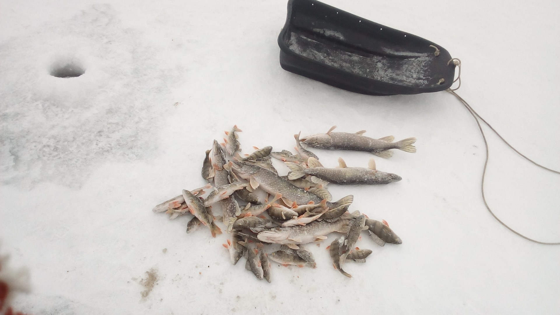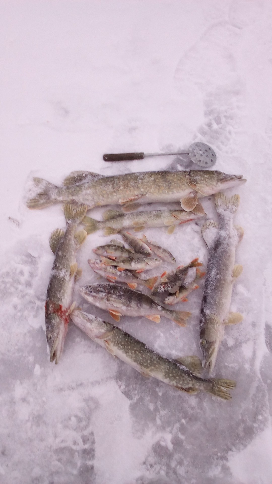 В субботу привычной компанией были на рыбалке, на Волге, в Петровском затоне. Видимо попали на "слом" погоды, было морозно, ветра не было, но и мороз не падал. Ловили плотву и густеру. Все отловились по- разному: ко-то больше, кто-то меньше, я поймал 3-и с небольшим кг. Ловил на мотыля, на донки, на арбалет. Время провели замечательно, рыбы наловили-что еще надо для счастливой старости? Правильно-денег побольше. Есть возражения?Да, место начинает понемногу капризничать. Сидим буквально в 10 метрах - у меня 7,8 кг (удивительное совпадение с Отморозком, правда по времени ловил меньше), у у друга и трех нет. Ну он расстроился, говорит давай поедем хоть окуней половим и живца(собирались за щукой, карасей как известно нигде нет. Где их кстати Гончаров берет - опять секрет). Ну и по окуню у друга не срослось - опять 10 метров между лунками, у меня штук 10 в районе 150 грамм, у него один живец. Ну не надо было говорить, что за ним едешь. Ну смех и грех , одним словом. Не его день. По щуке, кстати в воскресенье не очень. Две в районе двух кг. Но правда 4 схода чего то некрупного. Последовали совету ставить крупного живца. И вот результат.