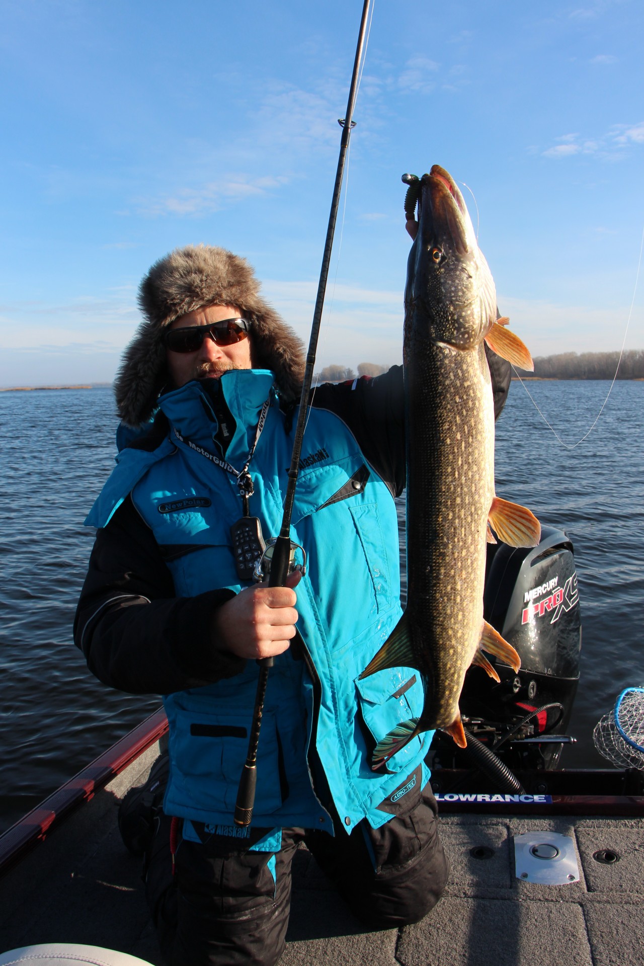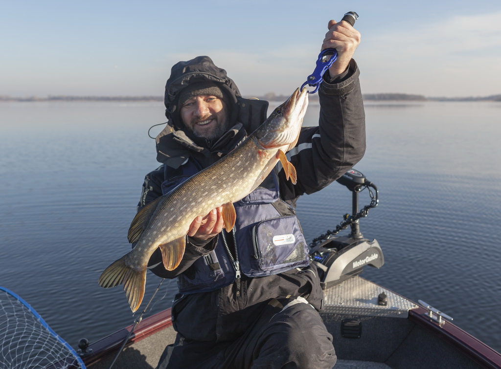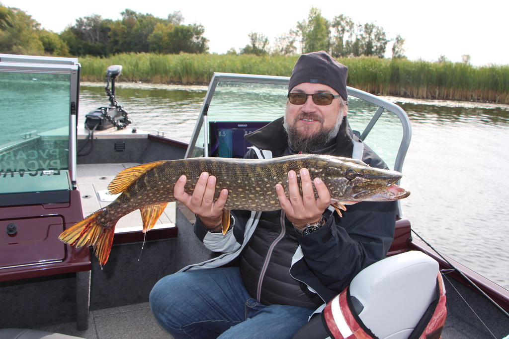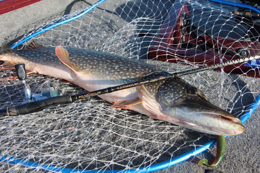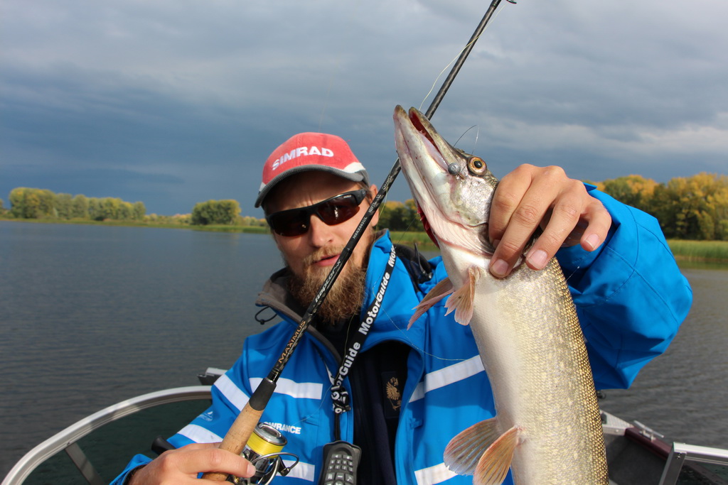 Заброс за забросом, смена проводок, касания бели. Говорю: «Столько судака переловил на Trigon, а щуку ни разу не поймал». Подвожу раттлин, и у самой лодки — мягкая поклевка. Подсечка, Standard гнется в дугу, и рыба начинает уверенно разматывать леску. Подтягиваю тормоз, и начинаю выкачивать противника.