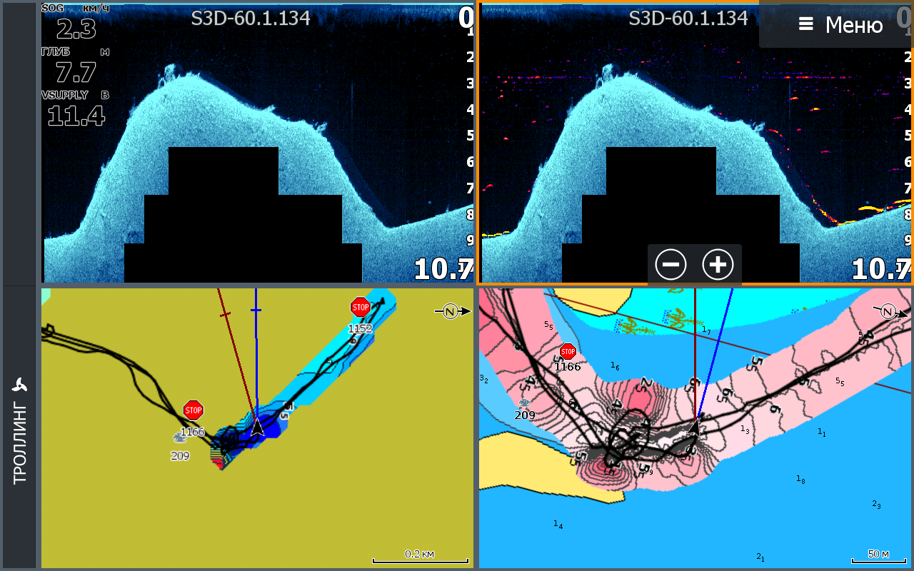 В этом месте больше поклевок не было. Ушли вниз по течению, но ничего интересного не обнаружили. Переместились в другой сектор. По свалу — коряги, а внизу — чисто и глубина пятнадцать метров. На нижней бровке видна бель. Ставим лодку. Женя продолжает ловить щуку со свала, а я — судака из ямы, на раттлин. В итоге, у Жени одна поклевка и сход, а у меня пара поклевок и один судачишка.