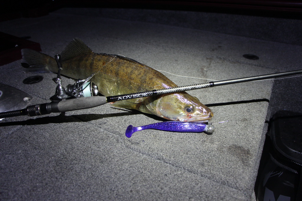 Поклёвка состоялась уже на первом же забросе. Какая-то невнятная, но при подсечке почувствовал тяжесть. Сопротивление, правда, немного странное. Трепыхание какое-то. Но довольно сильное. Оказался окунь под полкила. Довольно быстро опять вяленький тычок. Но вот спинн согнулся нехило. Ух ты, думаю! Упирается. Давит. Неужели судак? Хрен там! Щука. Правда под трёху. Ну, поводили мы друг друга немного, щука и сошла. Да и ладно. Не больно и хотелось. Но буквально через проходку ещё одна! Примерно такая же. Что интересно, тоже вверх не шла. Всё под лодку лезла. Эту вытащил. На предатор уже смотреть больно. :^{ А минут через пятнадцать на выбросе опять тычок. Есть! Эта сразу пошла вверх. Опять щука. [ssm45] Немного за кило. Как положено, свечу заделала. Погасил. Но у лодки дала бой, чуть ли не круче, чем её куда более крупные товарки. Тем не менее, тоже в мешок попала. Родне рыбки как раз обещал. И на этом практически всё. Ни потычки. Только уже после захода, когда поменял предатор-ультрафиолет на редкотовский кейтеч-чернила-5, последовало две поклёвки подряд. Первая - судак под кило, вторая - мимо. Поклёвки опять крайне невнятные.