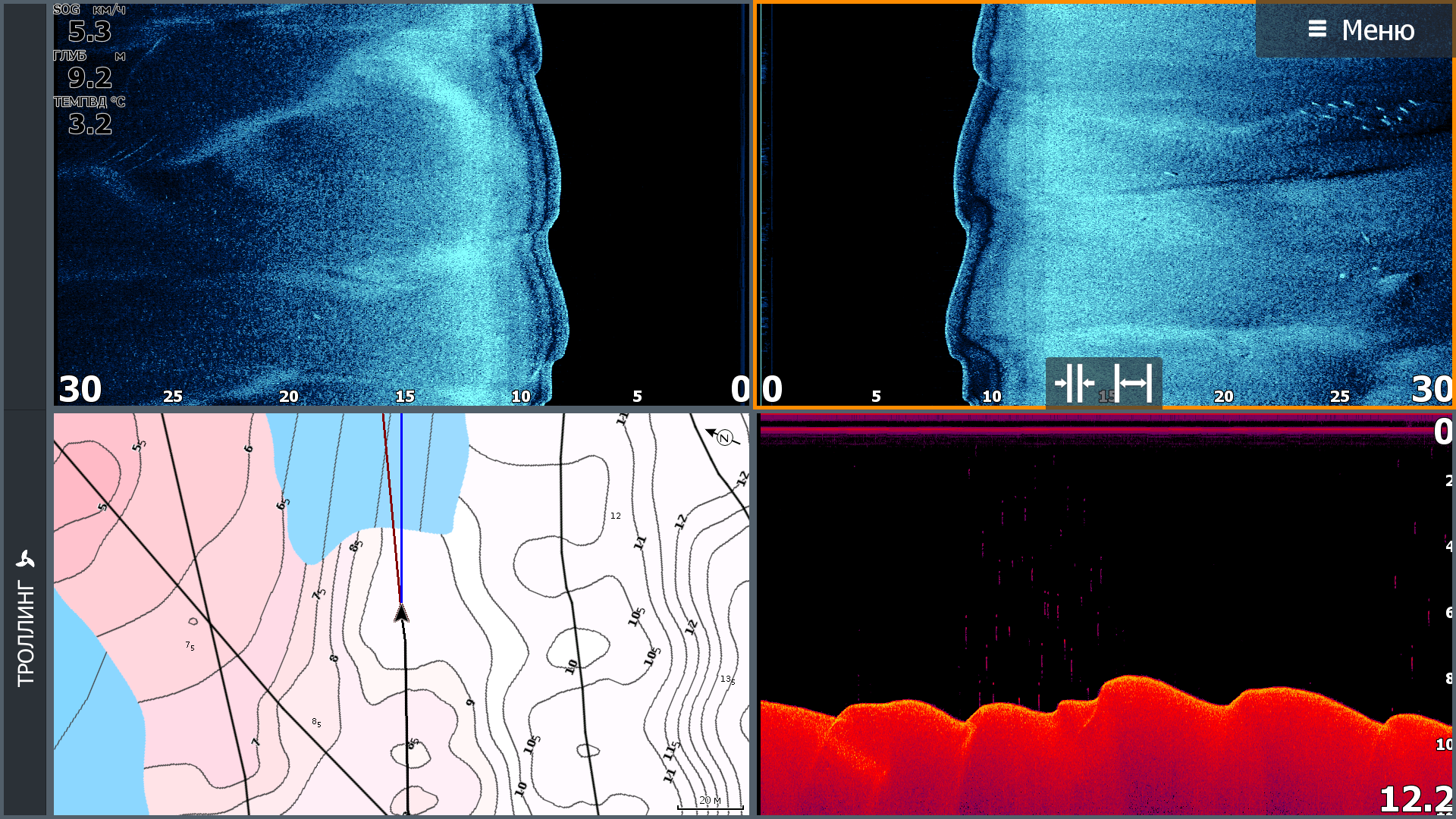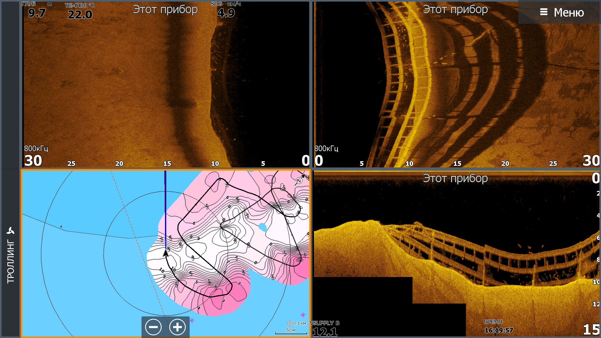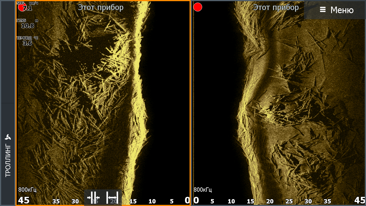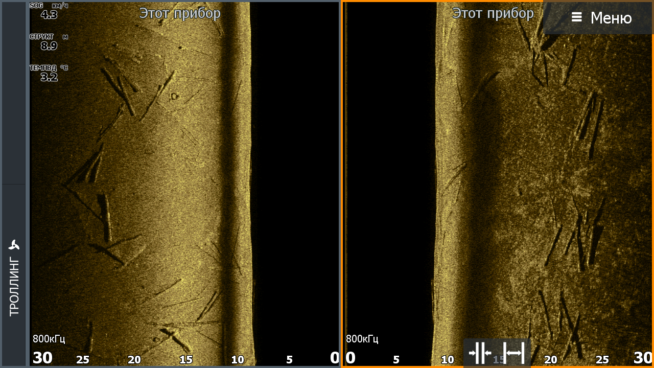 Датчик Lowrance ActiveImaging 3in1. Жесткий грунт. Остальные условия на скриншотах. Масштаб бокового обзора выбран 30м. На данной скорости при данном масштабе сохраняются геометрические пропорции объектов.