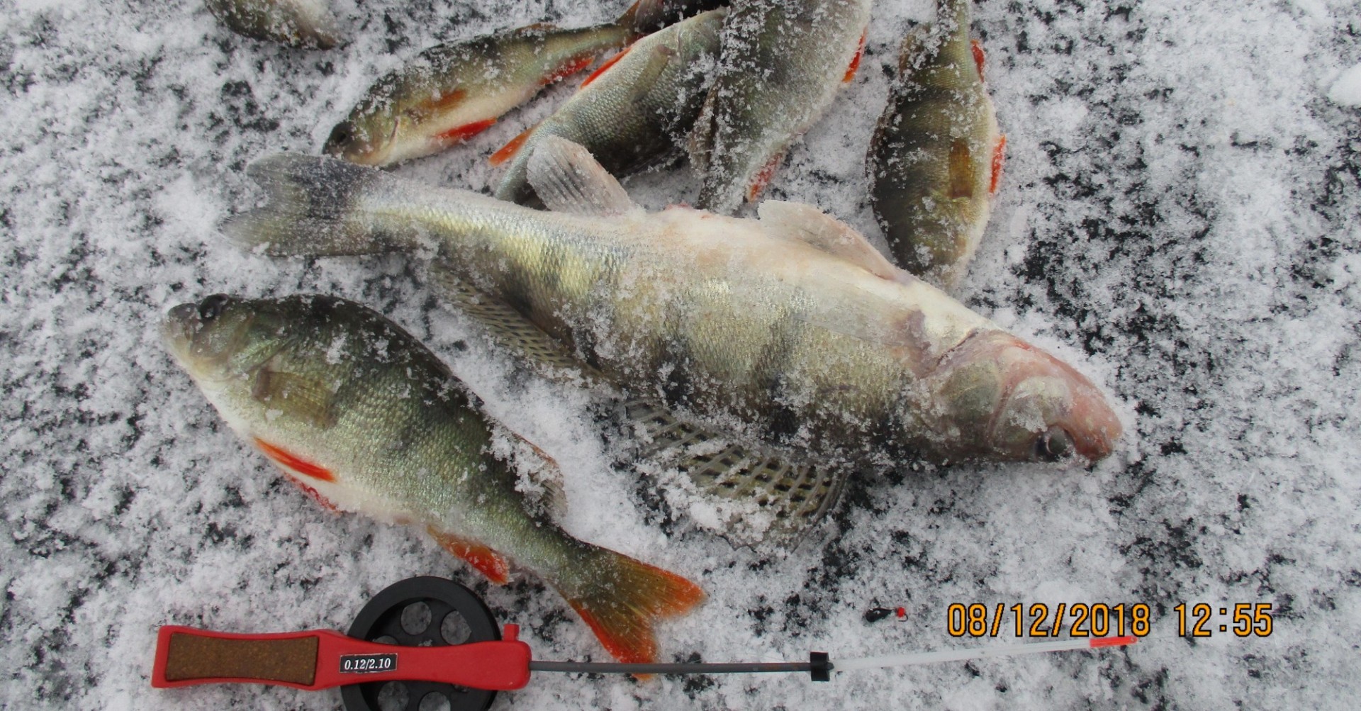 Утром немного опоздали,потому что со слов рыбаков в 6 утра клевало без перерыва.Нам же пришлось много бурить и искать рыбу.Ловилась по несколько из одной лунки,а лед еще метровый.