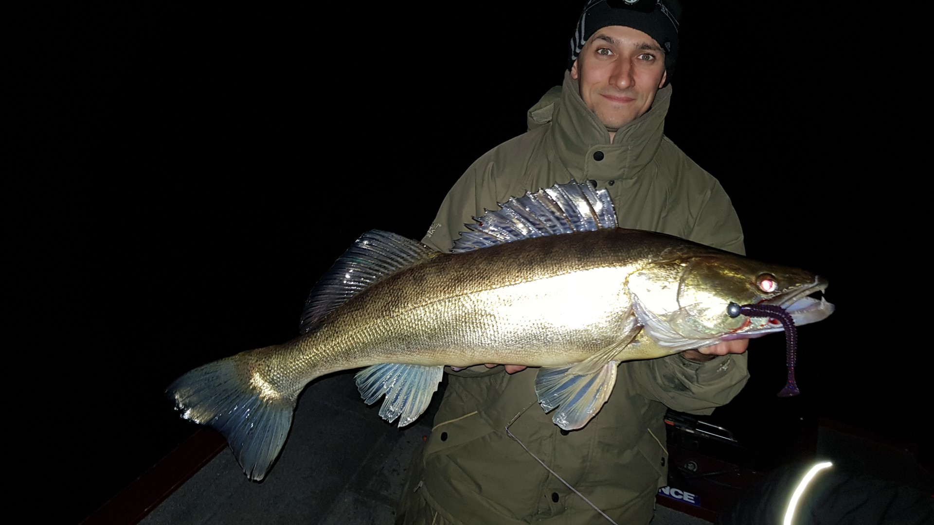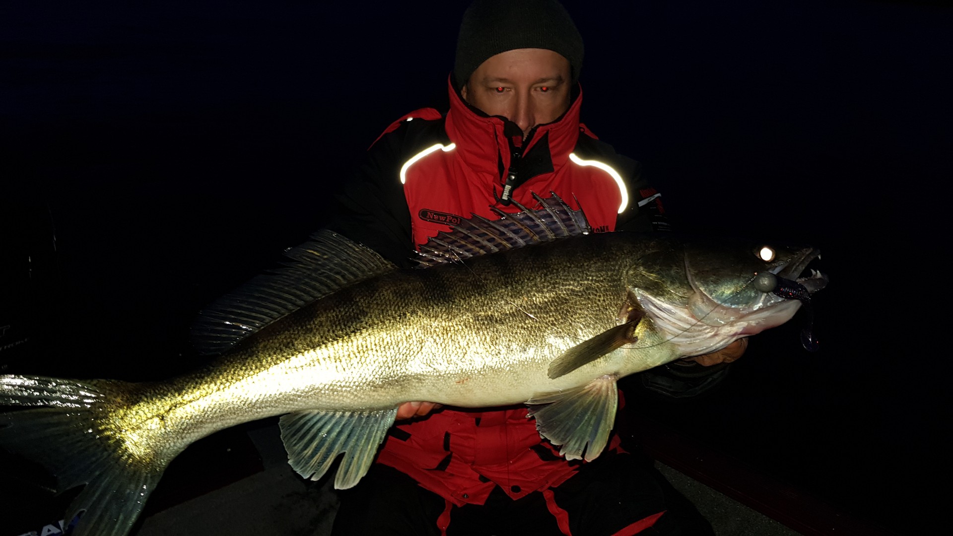 Учитывая очередной трюк наших водоначальников, решил попробовать поискать рыбу на глубинах до 15 метров. Вышел на одну знакомую точку. Там идёт свал метров на 18-20. А на 14 метрах довольно широкая полка. Вот на ней я и начал. И довольно быстро открыл счёт. Судак был так себе. Впритык в норму вписывался. Да и тюкнул еле-еле. Я даже и не понял, что это поклёвка.Ощущение, что просто об дно чуть сильнее стукнуло. На этой же проходке была ещё пара поклёвок, но обе кое-как. Меняю резину с м/м свинг импакт на блик арбуз. И на этот раз получаю качественный акцентированный удар и килошник отправился в холодильник.Но больше на этом месте ничего достойного не попалось. Либо мимо, либо утопленники. Решаю двигать в сторону ночных точек.