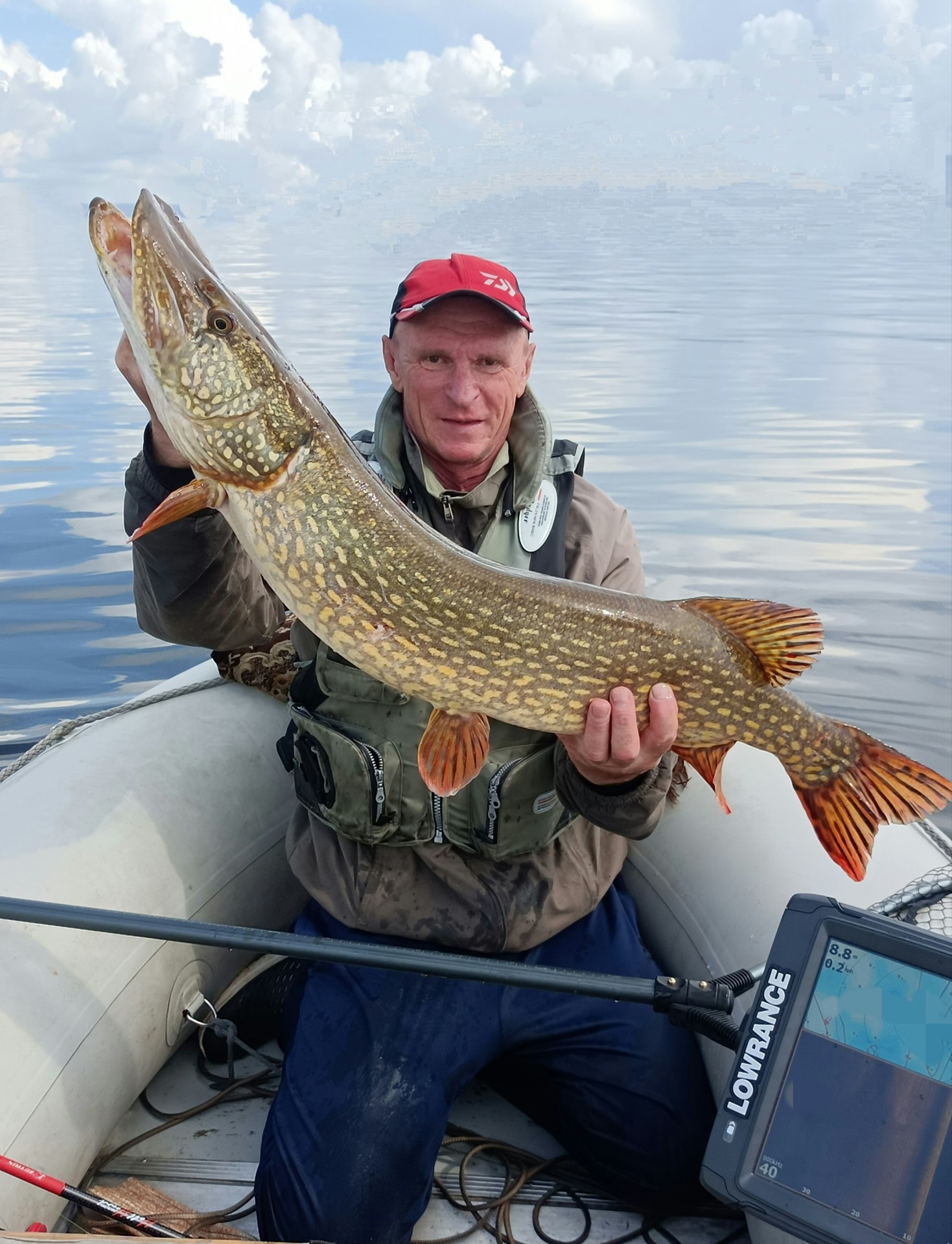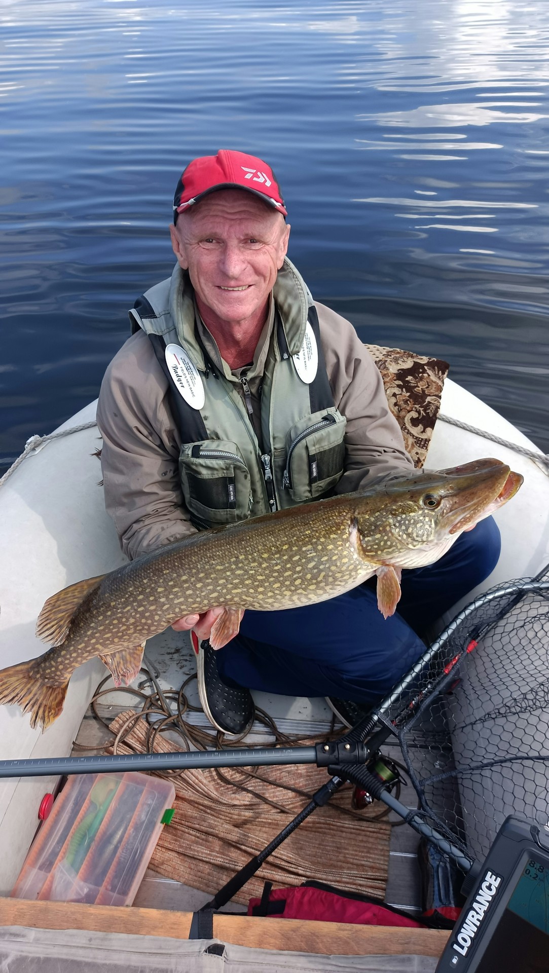 Потом много искали,но ничего нашли.Ну и примерно в обед ,опять на первом же забросе на fat 6.8 ловится трофейная щука десятка.Борьба с рыбой была долгой и напряженной,но в этот раз подняли рыбу на лодку ,сфоткались с бабушкой и отпустили.