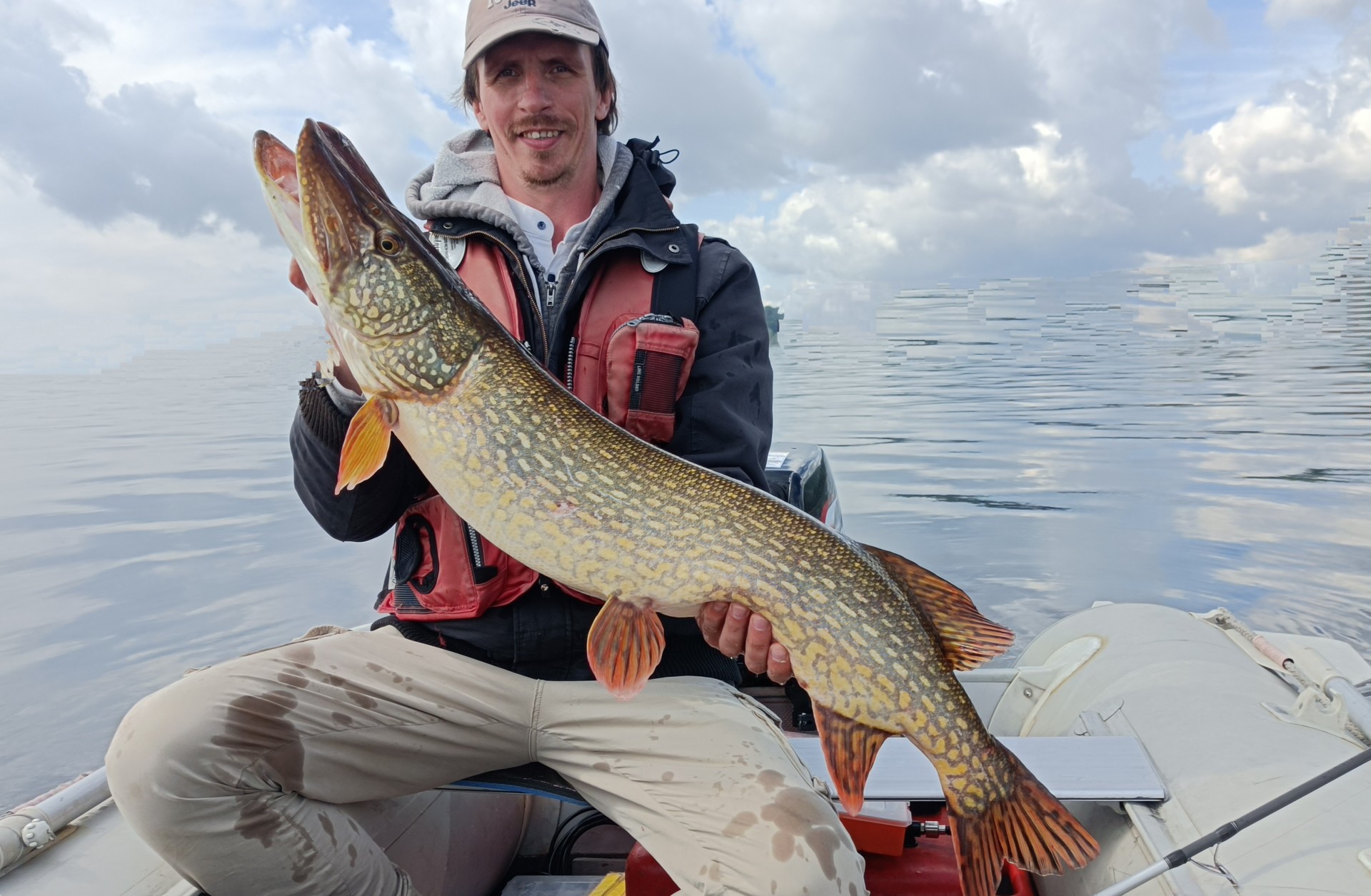 Утром не стали заморачиваться с судаком и сразу рванули за щукой.Когда пришли на место картина в эхолоте была не особо обнадеживающая.Но решили сделать несколько забросов.Обычно,если правильно встали на точку,то щука клюет на первой же проводке(конечно же если это проверенные приманки).Влад забрасывает фанкишад 6,9 пал 06 и у него клюет щука под пятак,я уже готов был принять рыбу в подсак,но почти у лодки щука сошла,хотя по мимо джиг головки стоял дополнительный тройник.Настроение конечно же упало,но продолжили ловить.Прошлись по провереным точкам,но рыба была не активная.Но одна щука не отличила кормовую рыбу от все того же фанки шад 6,9 и предстала на фотосессию