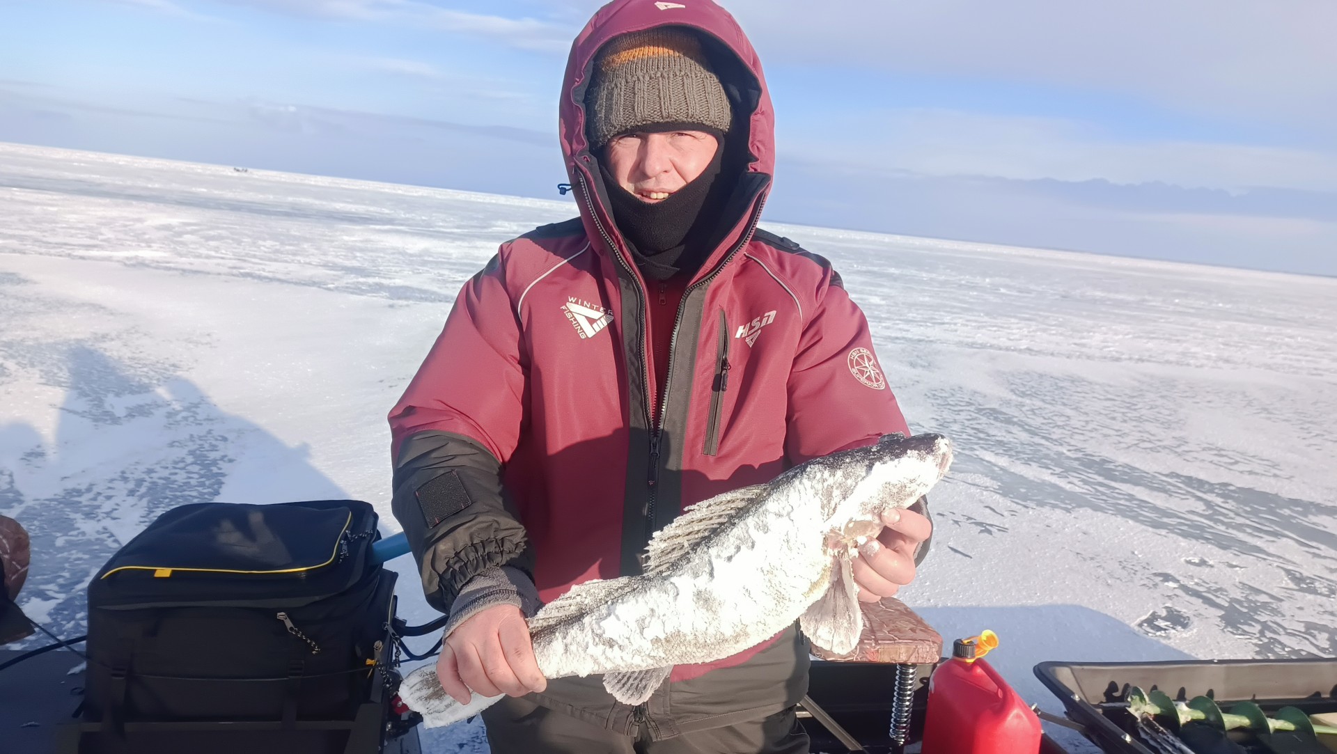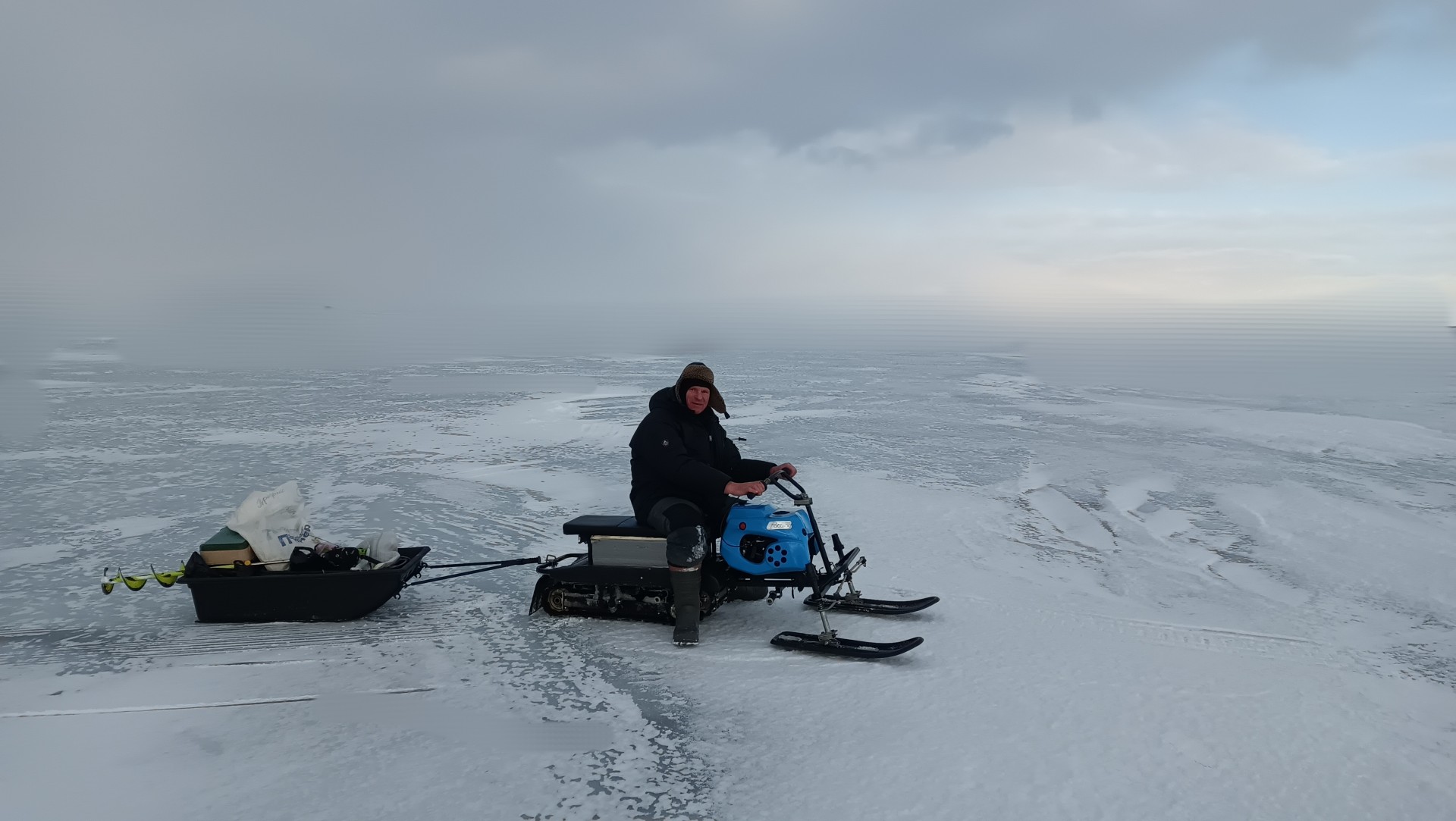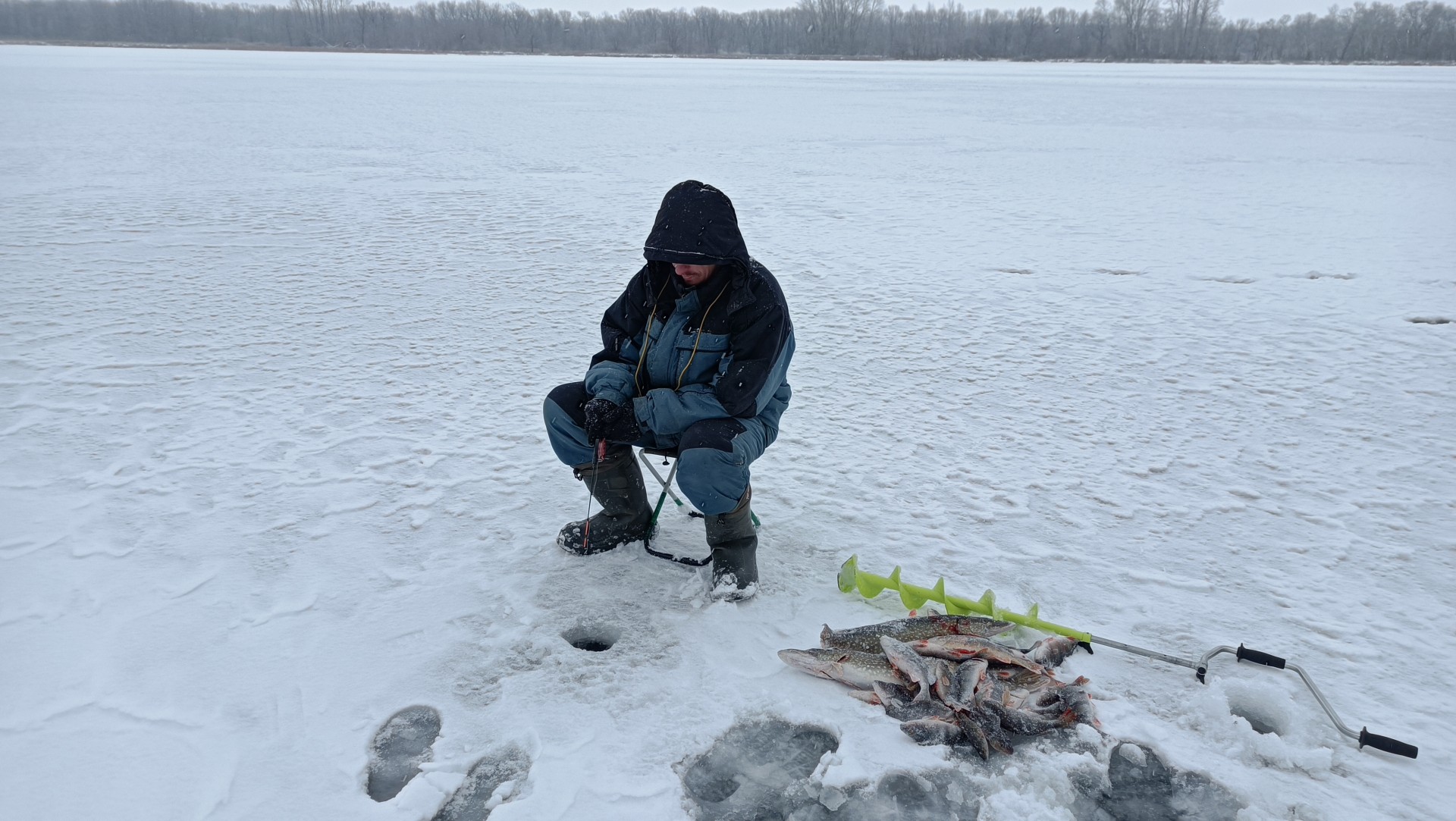 Приехав на берег, увидели , что мы не первые и человек ходит спокойно посередине и также видны ещё лунки в округе. Так, что мы спокойно пошли куда хотели .