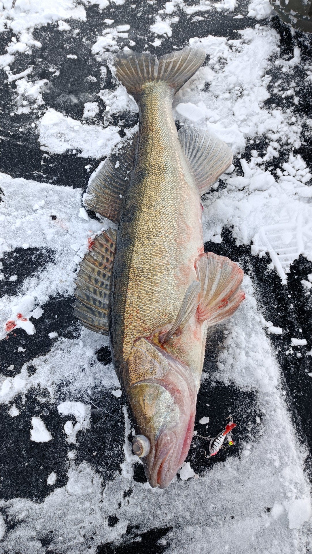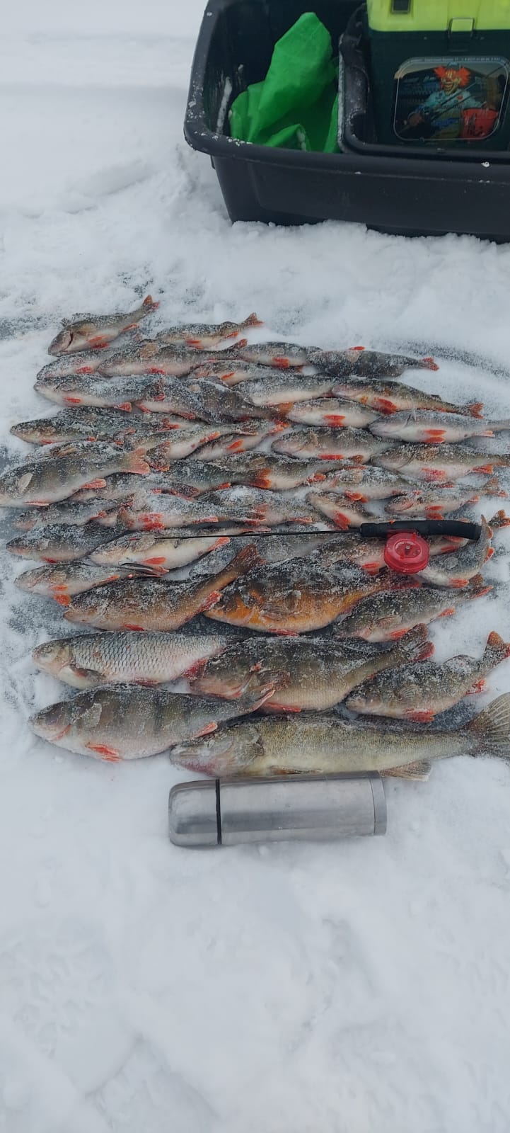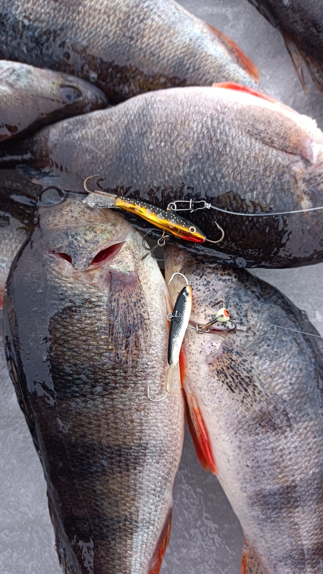 Потом сместился и дело пошло потихоньку. Окунь одиночный, не стайный. Слил 6-7закилошников прямо возле лунки. Двух все же взял. В прилове пару жерехов и судачек. Длилось это около часа потом затишье.