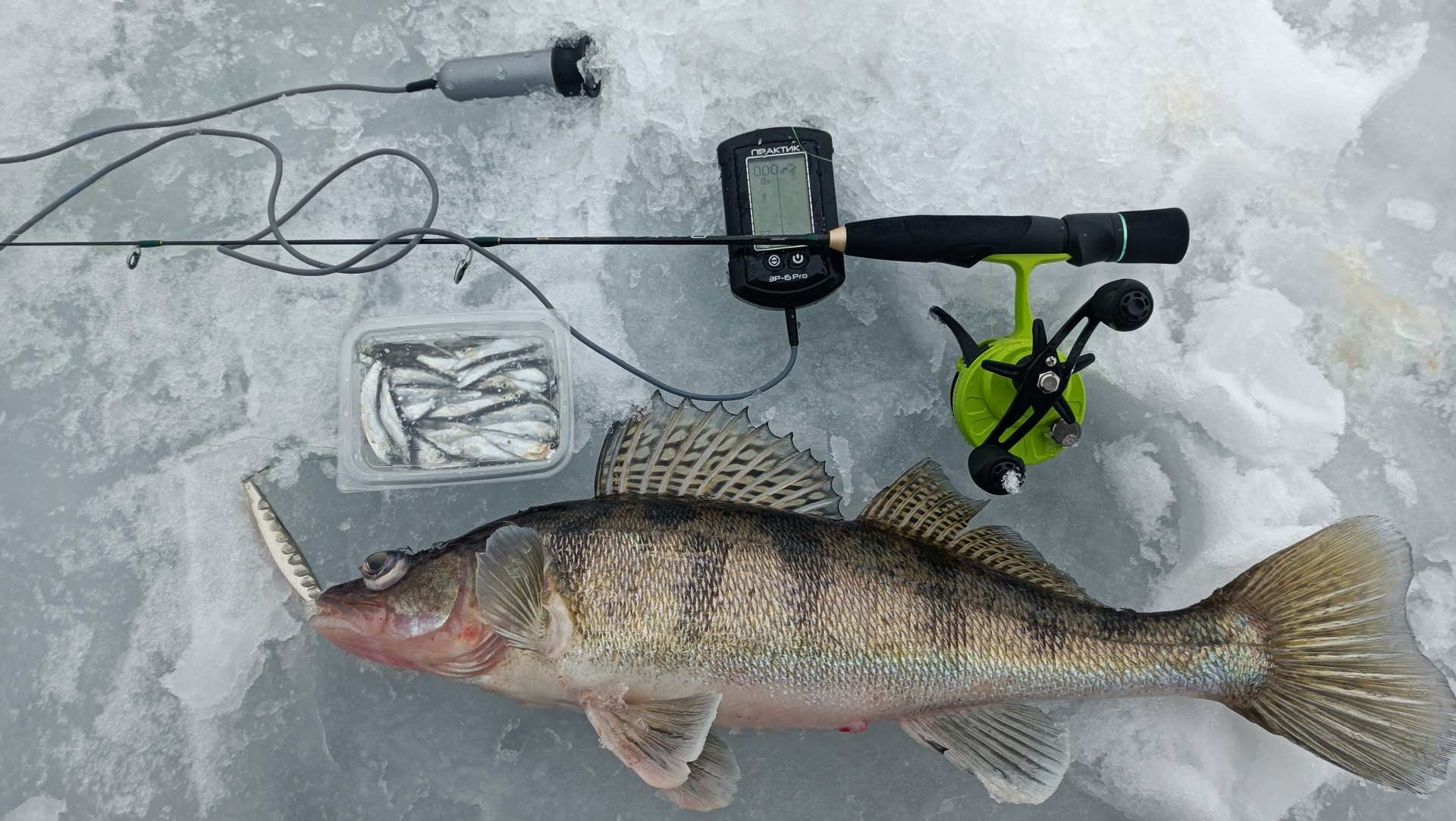 Эхолот Практик помогает понять что происходит подо льдом.Хорошо видно и приманку и подходы рыбы к приманке.Долго на лунках не засиживались и много бурили.Домой уехали 11 бершей,мелочь отпускали.
