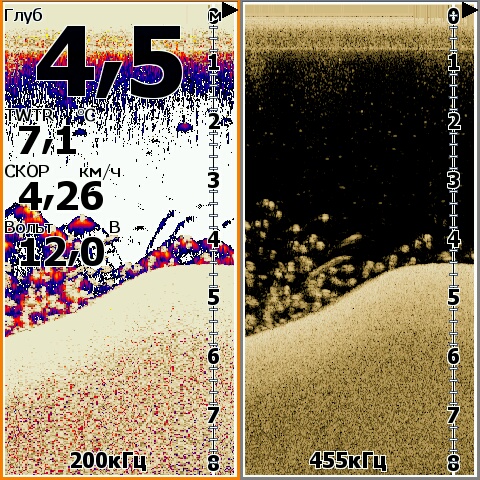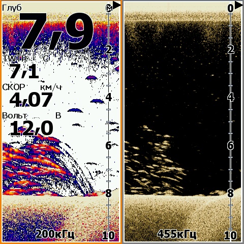 на левой части экрана на 4 метрах отмечены 3 рыбки а на правой части видно что реально там небольшая стая рыб, но на 3 метрах совсем на ясно как это так предполагаю что просто реально были воздушные пузыри