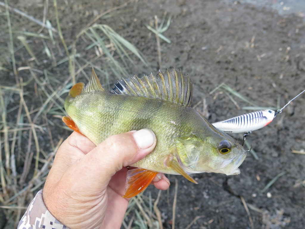 В субботу меня возили на какую-то лужу... А сейчас многие озера так выглядят. там осталась какая-то рыба. На уокер San-Pencial уговорил парочку окуней. Пробовал другие приманки - либо не летят, либо траву цепляют, либо окунь их игнорирует.