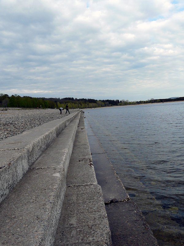 Всем привет! Тольятти, пляж 6-го квартала. Подъем, как обычно в 4.00, быстрый завтрак, прыг в машину и в 4.40 уже на берегу.Погода сахар-мед, полный штиль. Делаю первый заброс в темноту. Организм еще не проснулся, с закрытыми глазами начинаю классическую ступеньку, два оборота-пауза. Джига отстукивает песочек, я релаксирую. "Дзынь" - дошли до бетонных ступенек, очередной подрыв и ощущаю еле заметный контакт, подсечка на всякий случай и резкий визг фрикциона, от которого сам испугался. Сон, как рукой сняло. Подтянул чуть фрикцион, начинаю выкачивать, а у самого мысли крутятся, кто там такой здоровый, явно нестандарт для наших пляжей и вторая мысль, наверное, хрен вытащу, т.к взял в самом низу у начала ступенек. Только подумал слышу скрежет плетни о плиты. Нервоза добавилось, хотя тактика вываживания на пляже давно отработана. На автомате захожу в воду по колено, спиннинг на вытянутых руках над головой, скрежет прекратился и рыб вроде "пошел". Отлегло. Палка работает изумительно, рыб явно устал, последние метры практически без сопротивления подвожу к берегу. Окунь. Таких здоровых я еще не ловил. Пляж все-таки вознаградил меня за настойчивость. С начала сезона 2-3 рыбалки в неделю я все время ждал этой поклевки. Весов с собой не было, по ощущениям грамм 800-900. Если по досочкам ориентироваться рыб больше 30 сантиметров явно. Продолжил рыбалку. Ничего примечательного больше не было, окунь кушает, стандартный вес 150-200 гр., пара-тройка 300-400 гр., в шесть поехал домой спать. Если кто не знает, про какие ступеньки я говорю, вот такое дно у нас на пляжах, это фотка поздней осени, когда водохранилище сливают перед половодьем. Весной и летом ступеньки в воде, вся рыба стоит там, такая искусственная бровка, которая доставляет рыбакам много хлопот.