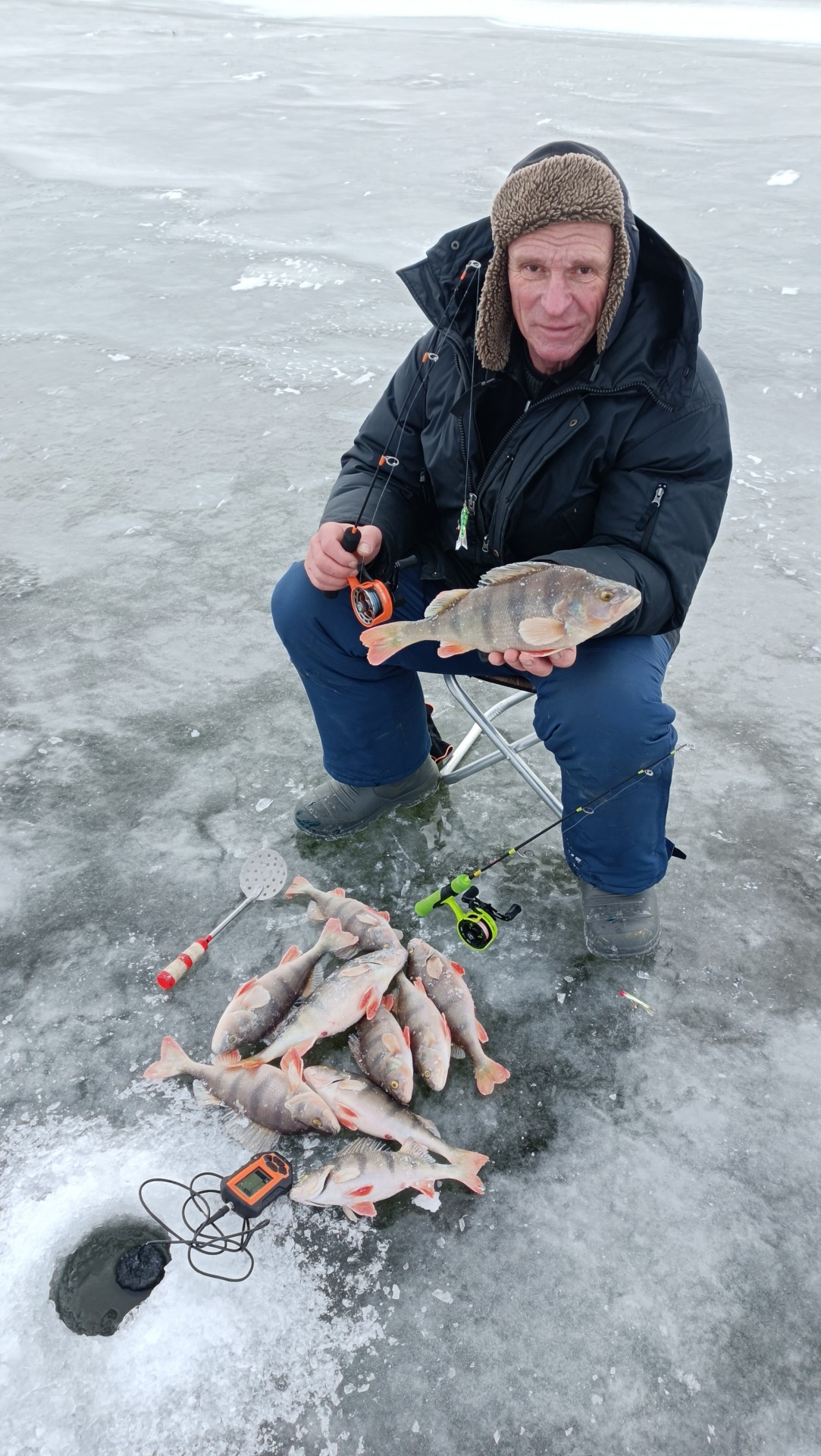 Пошёл ещё мельче. И на глубине с метр пошёл клёв. Ну как клёв. Минут 5 расеачиваешь лунку своей аккалой-каккалой не раппалой, потом начинает активно кидаться окунь, размером с балансир, потом 2-3 штуки 100-200грамм и тишина. Уходишь на соседнюю, тоже самое. Перетопил кучу детворы. Подкормил ворон негритятами. Сменил штук 5-7 лунок. А между делом ещё по работе начали названивать, чаще чем клевало.