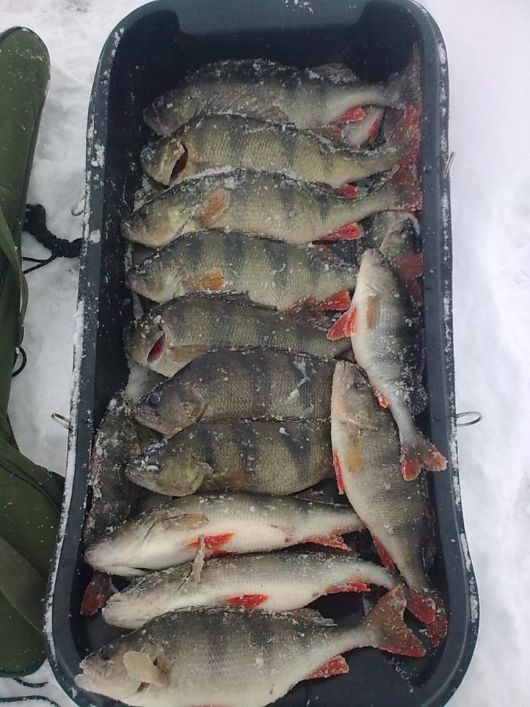 Даже скучно как-то. Весело стало тогда, когда было пробурено 35 лунок, на часах 11-30, а у меня 3 полосатых огрызка (у коллег не лучше). Решаю сменить место и ухожу в сторону от проверенной годами точки. На 3 лунке долгажданная поклёвка, чуть-чуть так кивок подпрыгнул, я подсёк, под кило. Через пару минут тоже самое, под кило. Потом какой-то мерзавец резко рванул и украл балансир. Потом бала встреча с очень хорошим, видел только его нос и левый глаз, он нырнул назад и как-то умудрился выплюнуть балансир. Руки - как с утра 04.01 (после рыбалки 03.01), трясутся. Такой дополнительной игрой соблазняю ещё 4 ТАКИХ ЖЕ. Ни кто не обуривает. Решаю позвать товарищей, мне уже хватит. Те завидев моих окуньков, бросили вполне едовую сорогу и бегом ко мне. Но видимо 10 новых лунок распугали стайку и клёвать перестало вообще. Бить меня не стали, просто ушли назад. А я поймал ещё 3 ТАКИХ ЖЕ и ещё немного среднего размера. Итого 12-13 кг, и размер. Вообщем удачной рыбалкой доволен.
