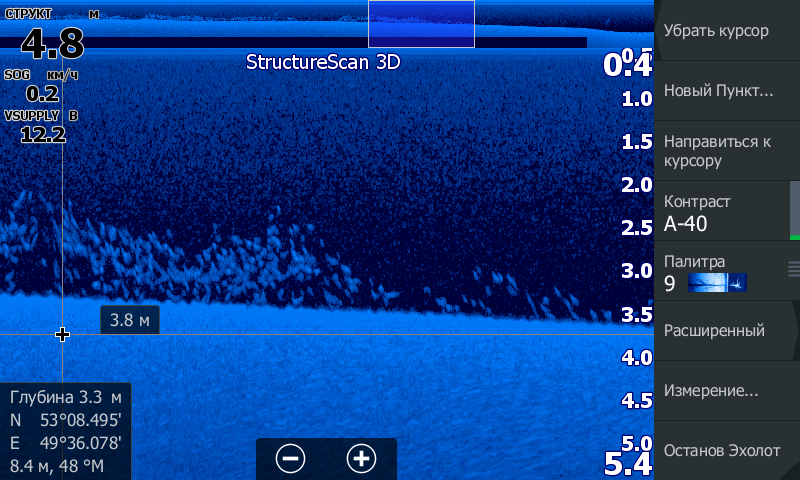 Проверяем одну, точку. Пусто, толко несколько судачиных поклевок. Не активный. Вторую, третью. Поклевок нет. Рано! В коряжнике стоит предвестник судака, небольшая стайка белой рыбы. Пока слабо, но уже начинает проявляться осенний типаж и осенние точки. Вот одна из таких на Lowrance StructureScan.