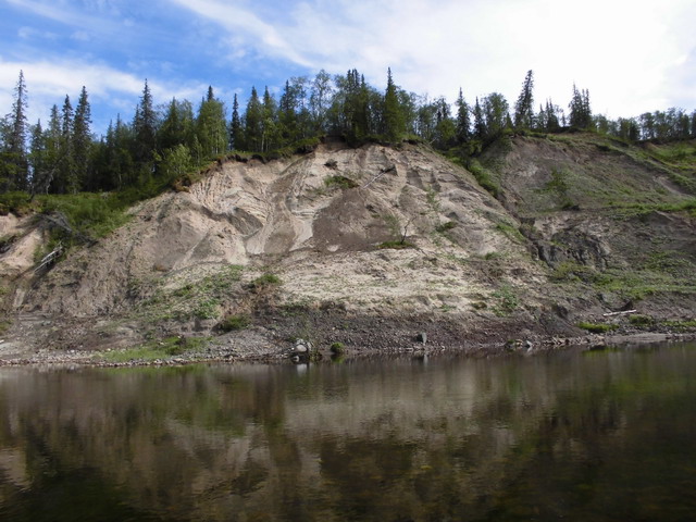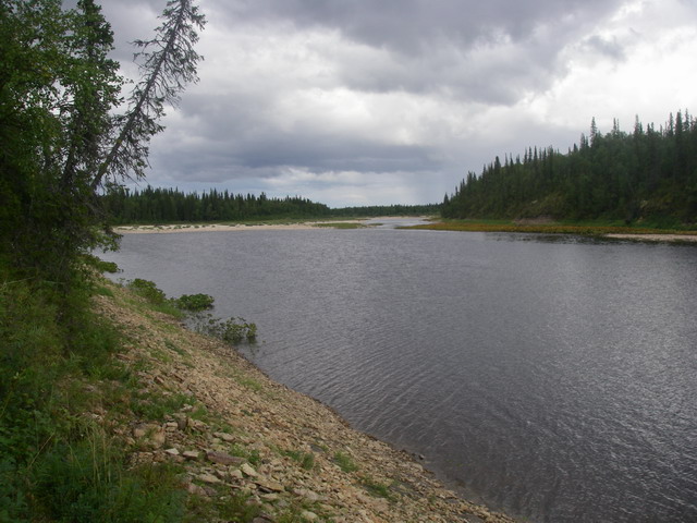 Речка впадает в Печору мощным потоком среди свеженамытых, осыпающихся в воду песчаных берегов, идти по краю которых, что бы тащить лодку, невозможно.