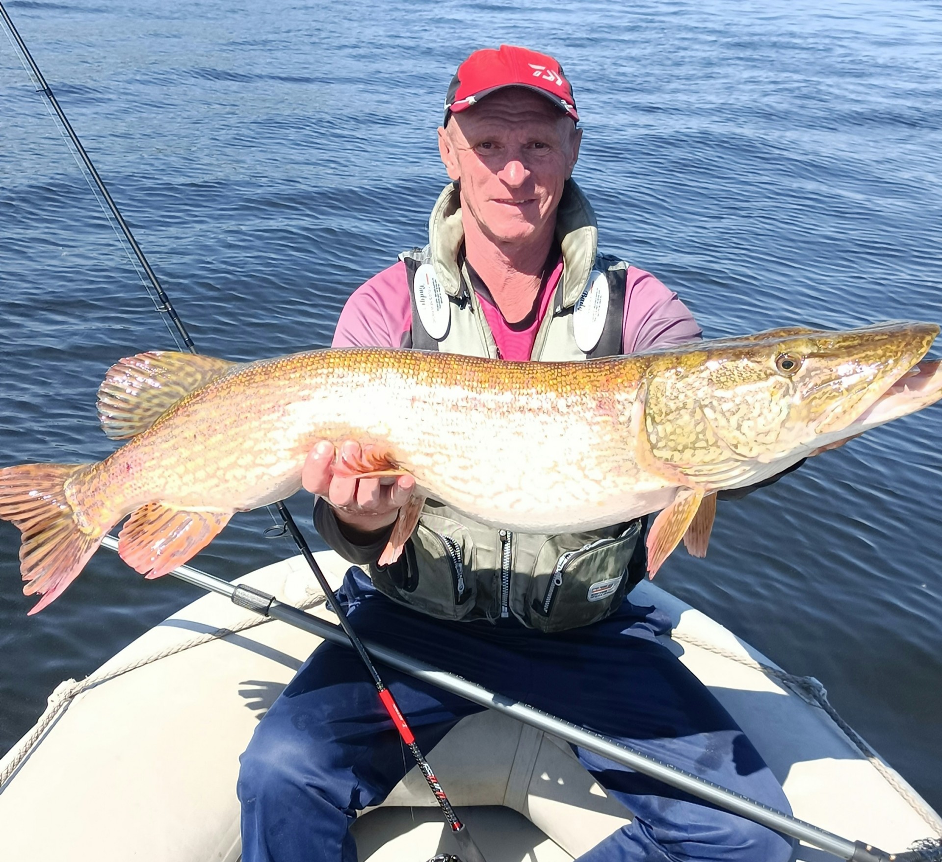Потом много искали,но ничего нашли.Ну и примерно в обед ,опять на первом же забросе на fat 6.8 ловится трофейная щука десятка.Борьба с рыбой была долгой и напряженной,но в этот раз подняли рыбу на лодку ,сфоткались с бабушкой и отпустили.