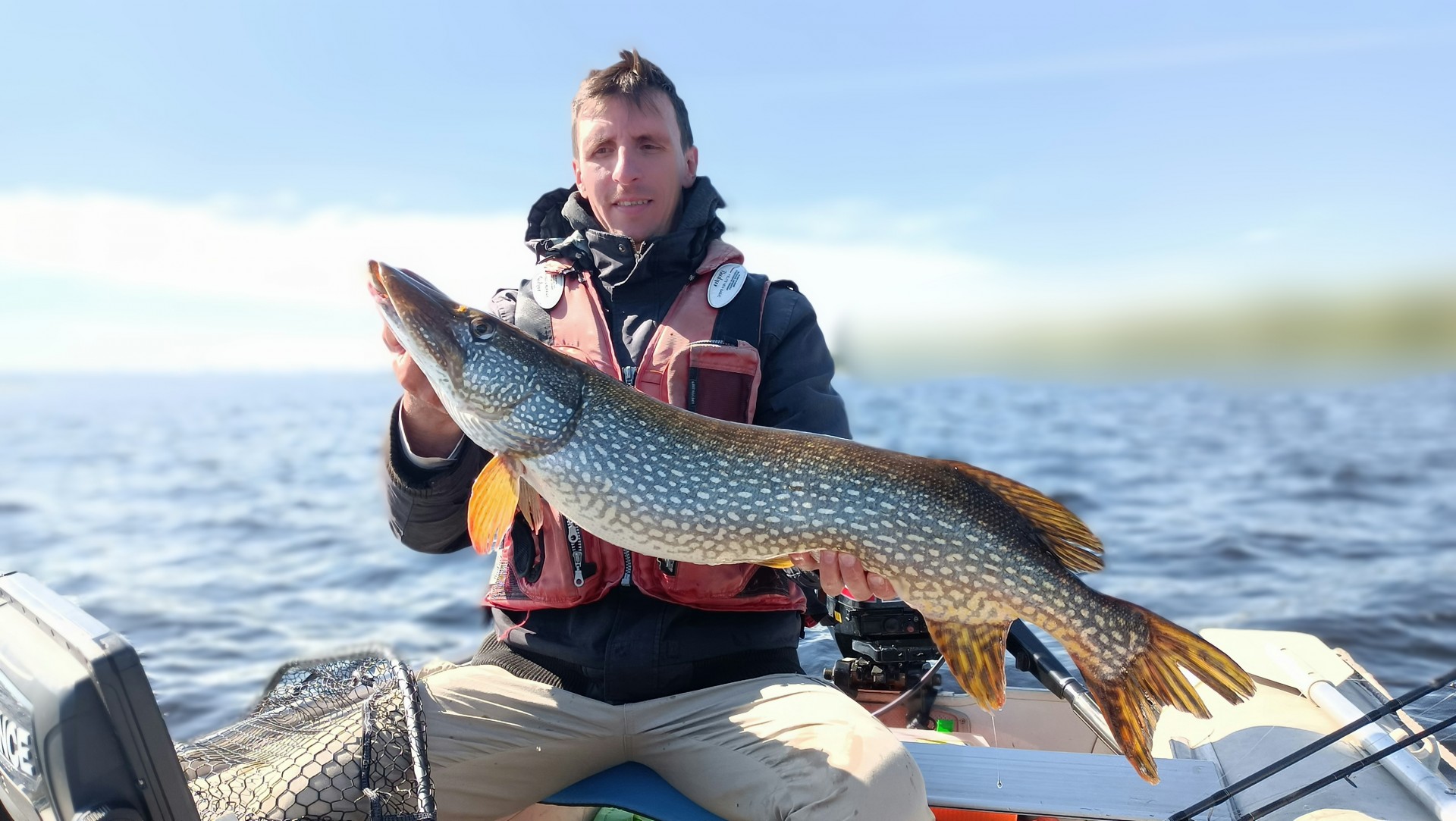 Потом еще здесь немного покидали разные приманки,но больше не поймали и пока не раздуло волну отправились на поиски щуки.Рыбу в эхолот видели,но не особо много. На одной из постановок Влад опять подсекает хорошую щуку на Geko 6,9 в нашем любимом 28 цвете.В этом и прошлом году все самые большие щуки были пойманы на эту приманку В этот раз щука была на 5 кг