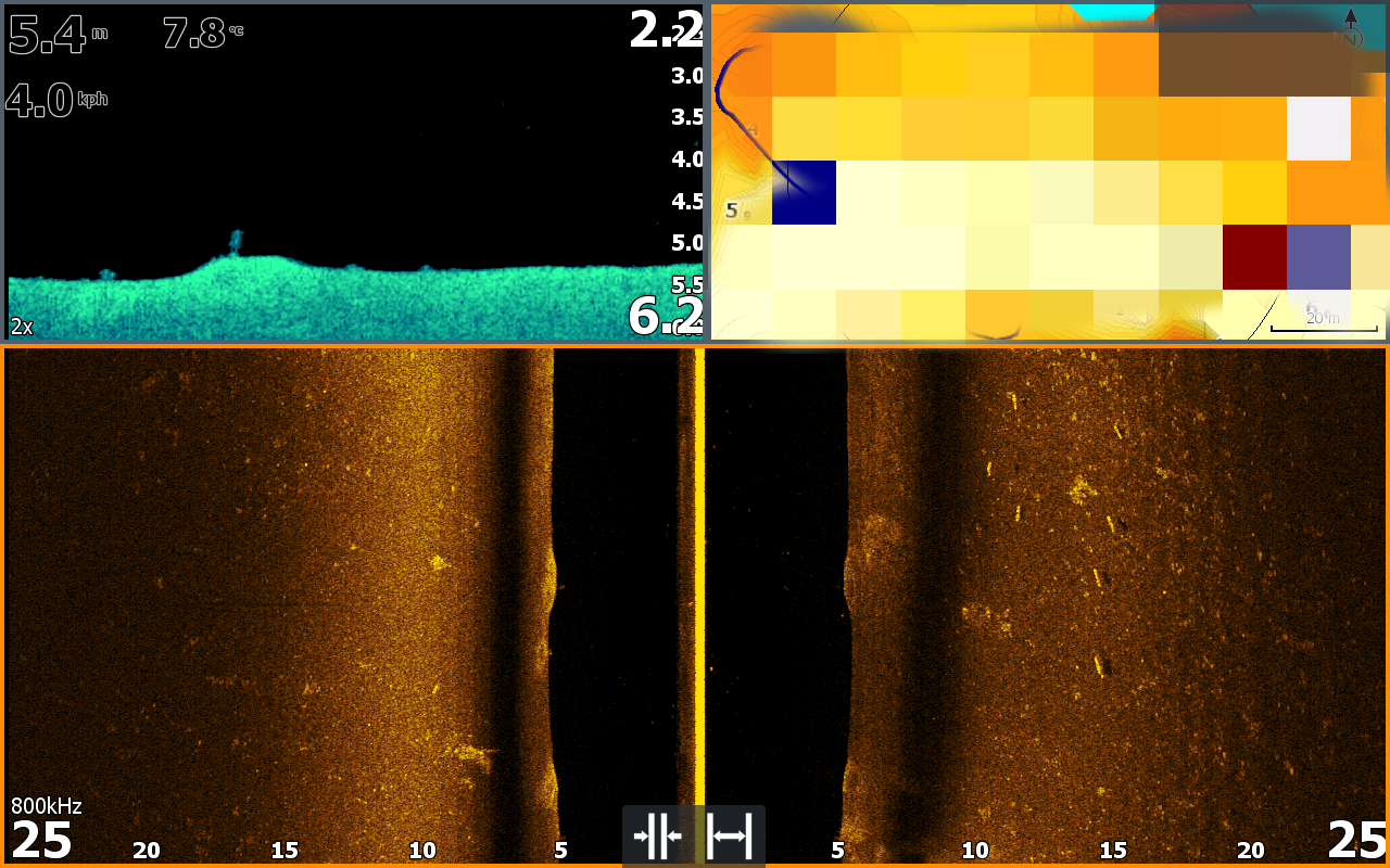 Что делать и куда ехать?Наверное можно было и на Чагру поехать,Там всего то 10 км оставалось,но мы там неделю назад были и в Чагринском заливе вообще рыбы практически не видели.Ну и поехали в сторону дома.Вернее почти в сторону дома.Решили еще заглянуть в Кашпир раз уж в этих местах оказались.Но когда подъехали,то как и писали раньше навигатор показал,что мы находимся в другом месте и даже к воде не подъезжали Ладно поехали дальше в Бестужевку .Там подъехали к паромной переправе.Там интересно было.У меня телефон местоположение правильно определяет у Влада нет.Ну и не стали рисковать и правильно,потому что чуть дальше тоже глушилки работают.Потом через Обшаровку и еще по полям через Нижне-Печерское доехали до Васильевских Островов.К этому времени на спидометре было уже почти 300 км вместо 100 км и часы показывали 10 утра То есть мы 5 часов утром катались по области просто так.Ну и времени уже оставалось меньше чем обычно,по этому решили не искать рыбу,а сразу проверить осенние точки.Влад ловил Хайроном до 200 гр.на крупные приманки,я ловил Хеллхаундом до 70 гр на мелкие мыши и силикон.На самом нашем козырном месте рыбы практически не увидели.Штуки 3 валялись на дне,но не клевали.Ну и после проверки этого места начался поиск.Щук видели достаточно много,но все какие то одиночные,фиг знает как их поймать. Пробовали по всякому,но ничего.Давай искать дальше.И вот в правом луче появилась хорошая щука,потом еще одна,и ещё и ещё,короче нашли какое то щучье эльдорадо.