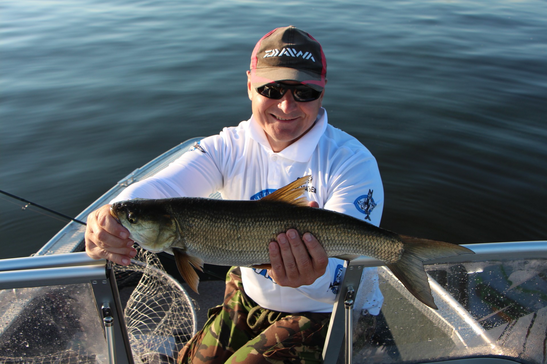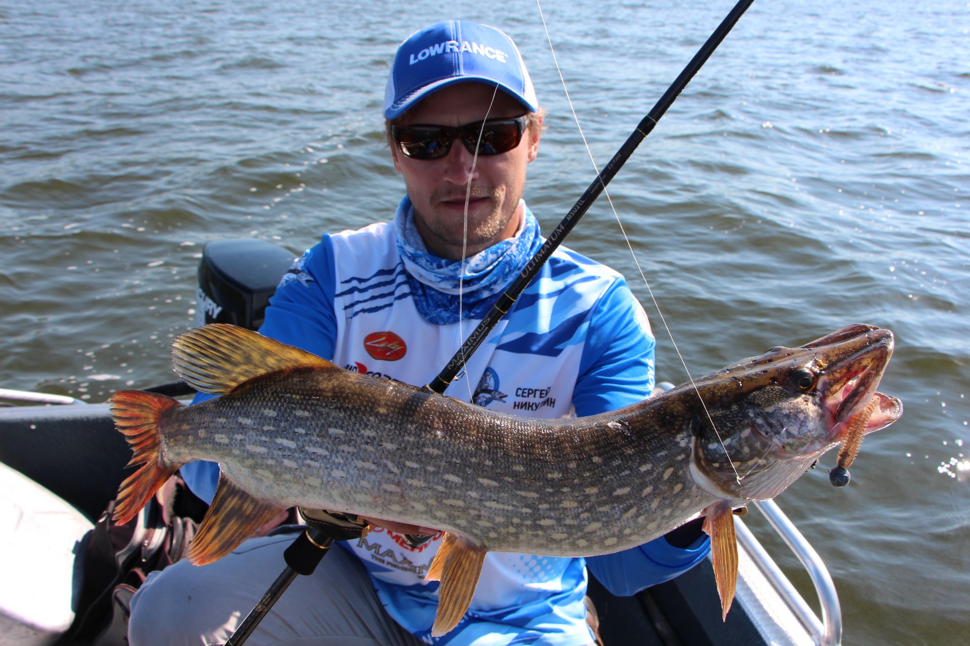 А потом подул приличный ветер, и меня и так потащило в сторону берега. И опять-таки, как только я увидел, что на эхе уже меньше шести метров и шансы налететь на щуку резко повышаются, и, следовательно, надо переезжать, как она врезала! Упиралась мощно, но когда поднял, то на поверхности вела себя весьма спокойно. Хотя сразу было видно, что за трёху. Но, как только я попытался подвести сачок, как эта тварь как рванёт! Пришлось откладывать подсак в сторону и приступать к укрощению строптивой. Эта зараза метнулась под корму и попыталась завести за мотор. Но эту диверсию я пресёк. Тогда паразитка пошла на свечу и врезалась снизу в подсак, который лежал на борту так, что сам сачок, то есть сетка, был над водой.
