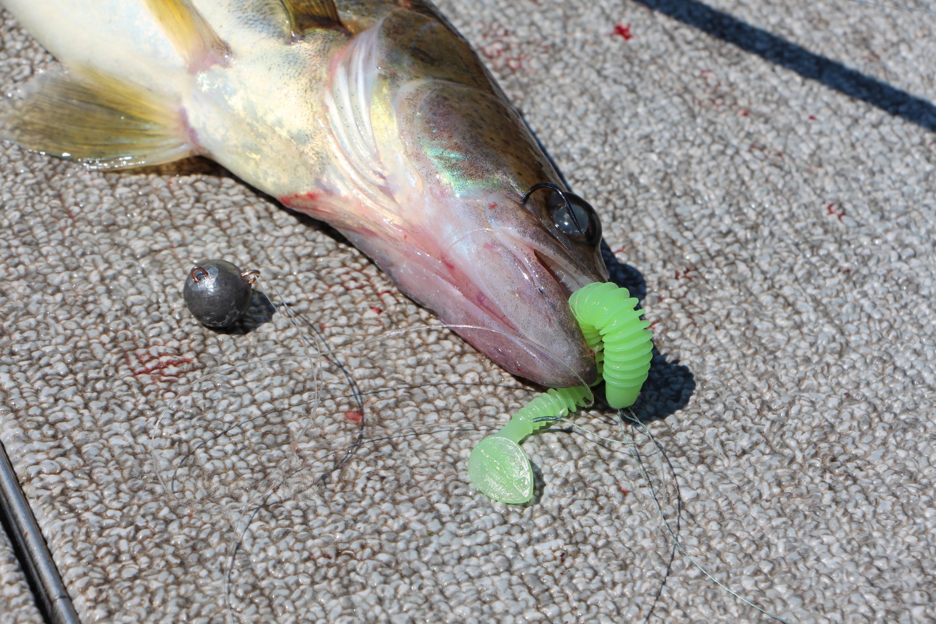 Ловили на крупный крупный силикон. Я ловил на Lunker City SHAKER 6". Поразила жадность мелких щучек. На фото ниже, щучка граммов на 700, шейкер шестёрку заглотила полностью и джиг-головку тоже.