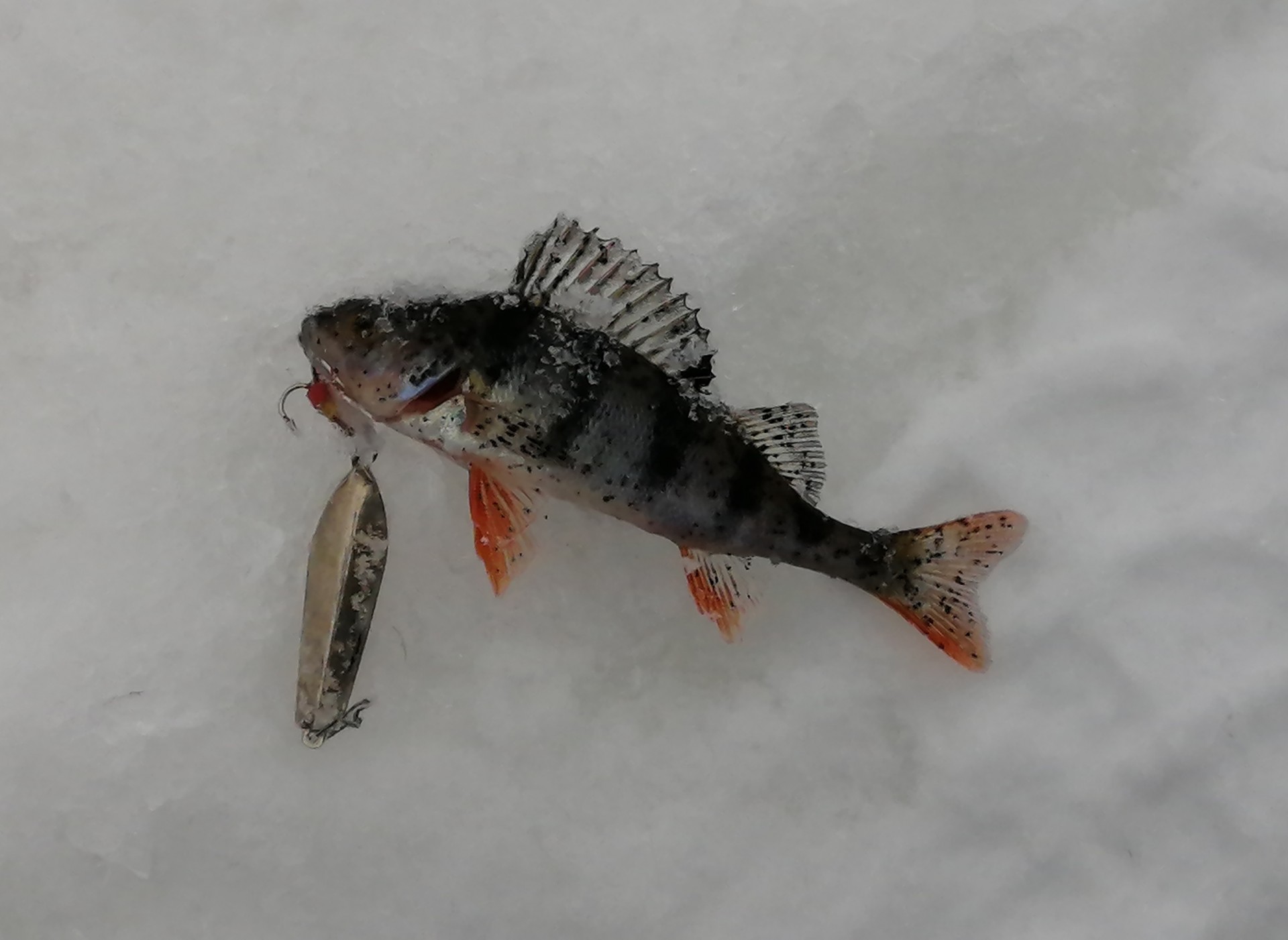 Приехали рано утром. Народу немного, тишина, только скрип снега под ногами да звук бура. Пробурили несколько лунок на разной глубине — отмели и чуть поглубже. Решили начать с классики — поиск активного окуня.
