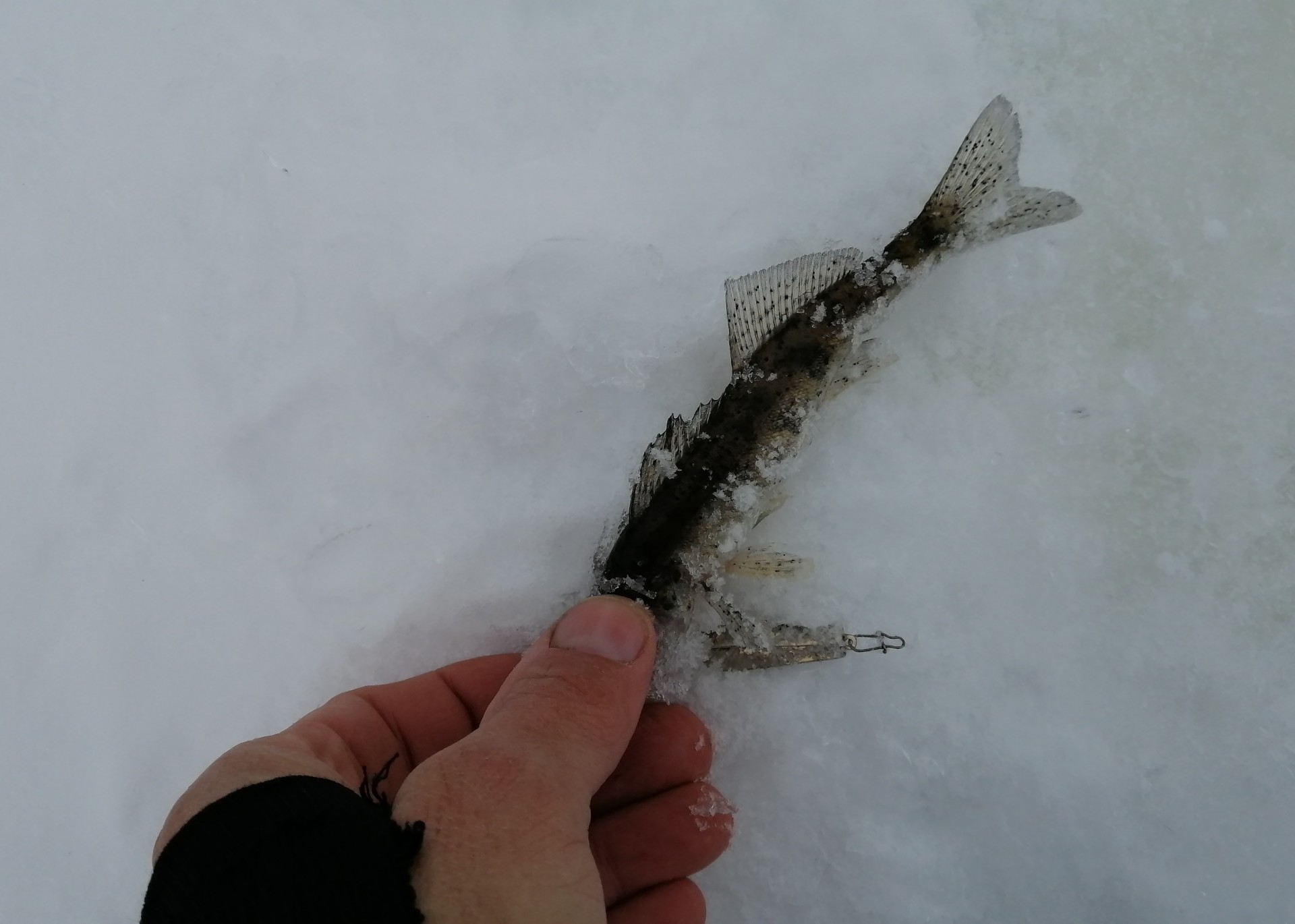 Через 40 минут бурим первые лунки — и первый судак тут как тут! Правда, граммов 200, не больше. Дальше начинается то, что каждый рыбак знает слишком хорошо — поиски. Шесть километров пешком по льду, первый аккумулятор почти на нуле, а достойного судака всё нет.