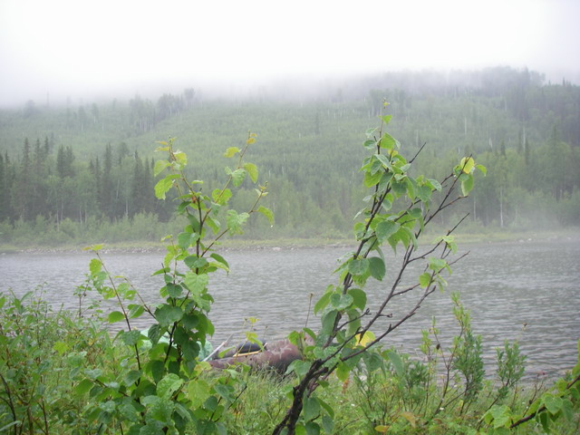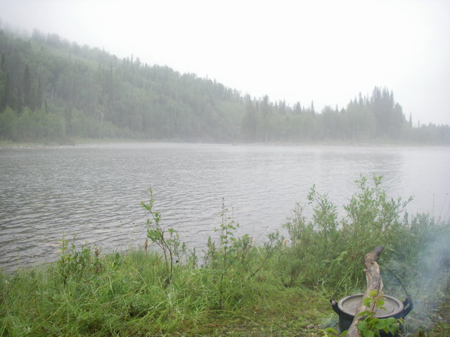 Утром (день шестой) с небес всё ещё немного капает. Река ещё чуть выше, чем ночью.